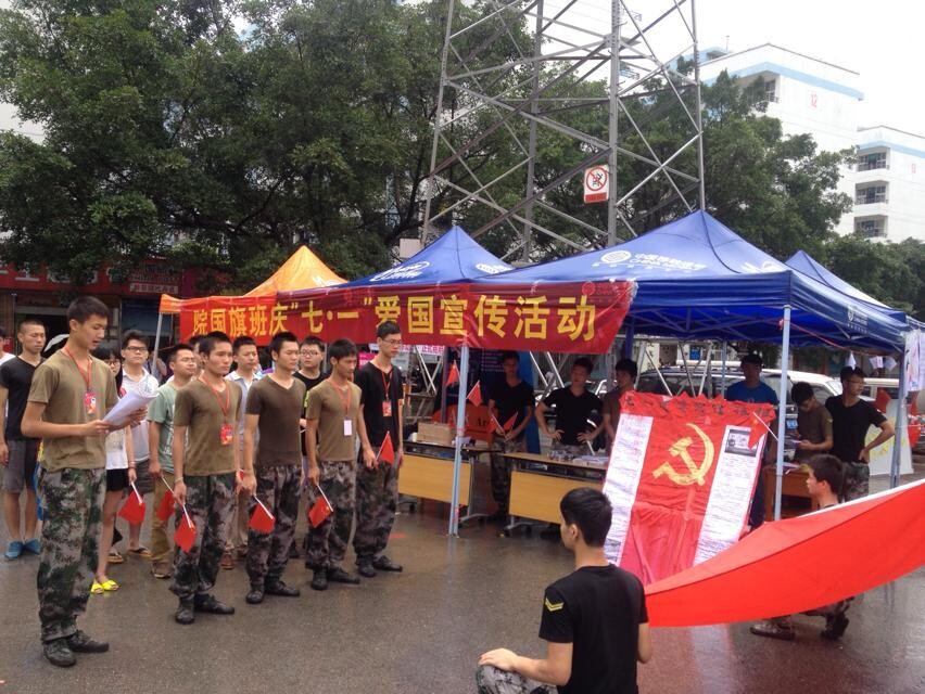 为庆祝建党93周年,由院团委主办、院国旗班承办的“歌颂党、弘扬党、赞扬党”庆七一爱国主义宣传教育活动于7月1日在校内举行。院国旗班作为我院爱国主义教育基地的学生团体,与电子信息工程系20名入党积极分子、预备党员同近百名师生共同在坡下举行了庆?;疃和盼榧峭趸?、周虹老师也到场参加了活动。
