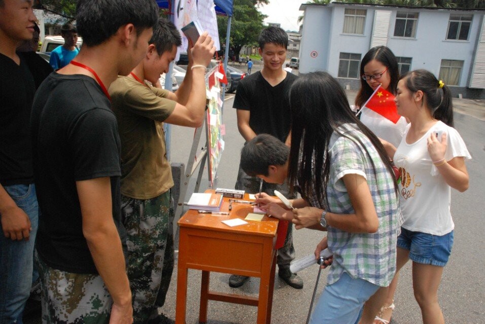 虽然当天大雨倾盆,但是活动特别采用了送祝福、有奖竞答、现场播放爱国歌曲宣传党的建设成果、党的发展历史,内容严肃、形式活泼,更容易让参与活动的师生接受从而参与到活动中来,现场的同学都有特别深的感受。来自2013级国旗班队员韦长中同学说:“作为一名大学生,我们要了解党在建设过程中的艰苦曲折和取得的光辉业迹,时刻保持积极的政治热情,更好地锻炼自己,从而全面完善自己?!卑嘀魅沃芎缋鲜σ苍谙殖「枇斯睦椭傅?。
