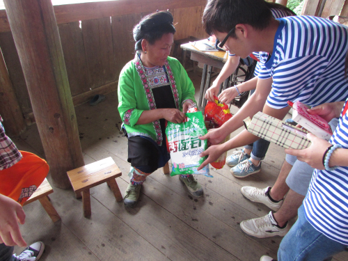 七月底,2014暑期“三下乡”社会实践服务队赴融水县的下乡服务活动已经圆满结束。此次“扎根”服务模式使三下乡活动更加有实际意义——时间长,了解深,服务实、效果好。除了开展常规的的义务支教、家电维修、慰问孤寡老人以及贫困家庭、播放电影、举办文艺汇演,还在这些活动上进行了改进、完善。支教内容除了借鉴以往的经验,针对学生们的实际情况,开始兴趣课程,还开设了“关爱女童”“?;つ型钡雀呤导室庖宓目纬蹋患业缥抟苍谌ツ昃榈幕∩?,针对性的补充老旧电器的常用零件,出发前专门找老旧家电的图纸进行研究;在走访农村家庭过程中,调研孤寡老人的物质、精神生活情况,以及农村子女受教育等问题,积极的提出一些开导性对策;根据去年工作的反馈,播放经典红色电影,以及文艺汇演,丰富精神文化生活。进过这几年的下乡服务,与村民的接触,村民自发的给服务队送来瓜果蔬菜,感谢实实在在的帮助。