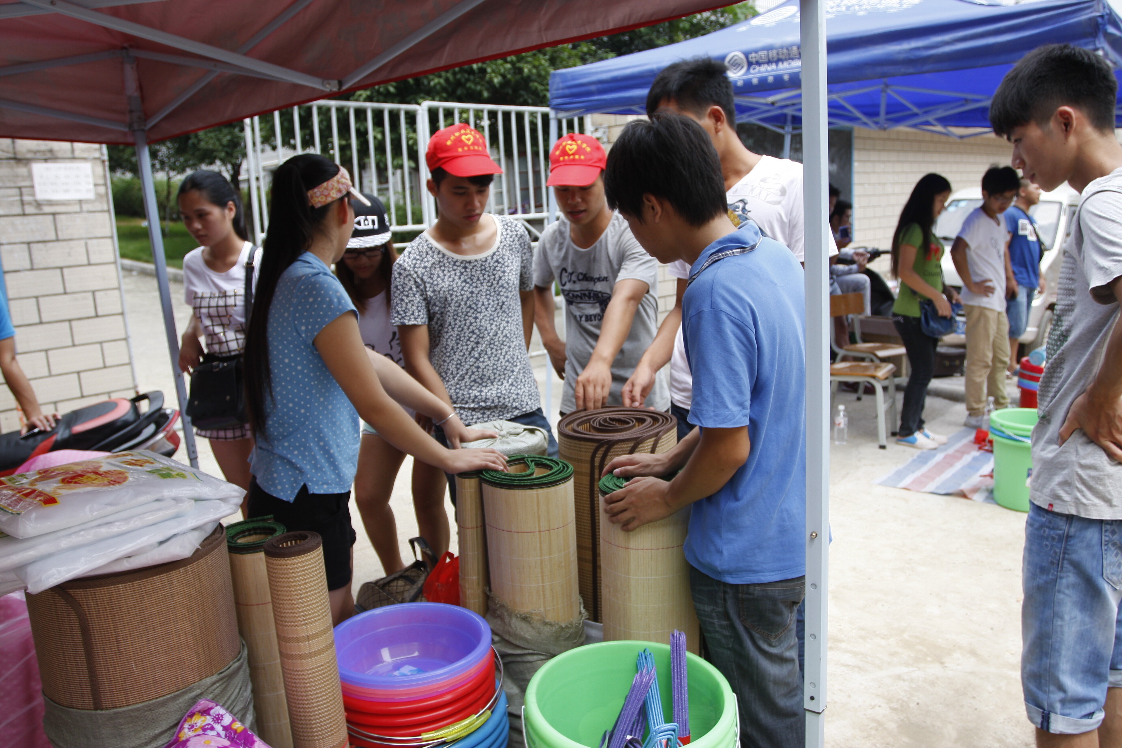 新闻网消息(记者石玉丹 摄影朱敬民)13日,在我院迎新现场看到, 各系在保证服务新生的服务质量外,由学生自己组织货源、商务实战社团举办的一字排开的各日用品摊点,也为新生提供了细致周到的服务。一名老生说:“来这里摆摊,一个是可以服务学弟学妹们,再一个,我们想了解,社会上那些老板是怎么做生意的。一举两得!”