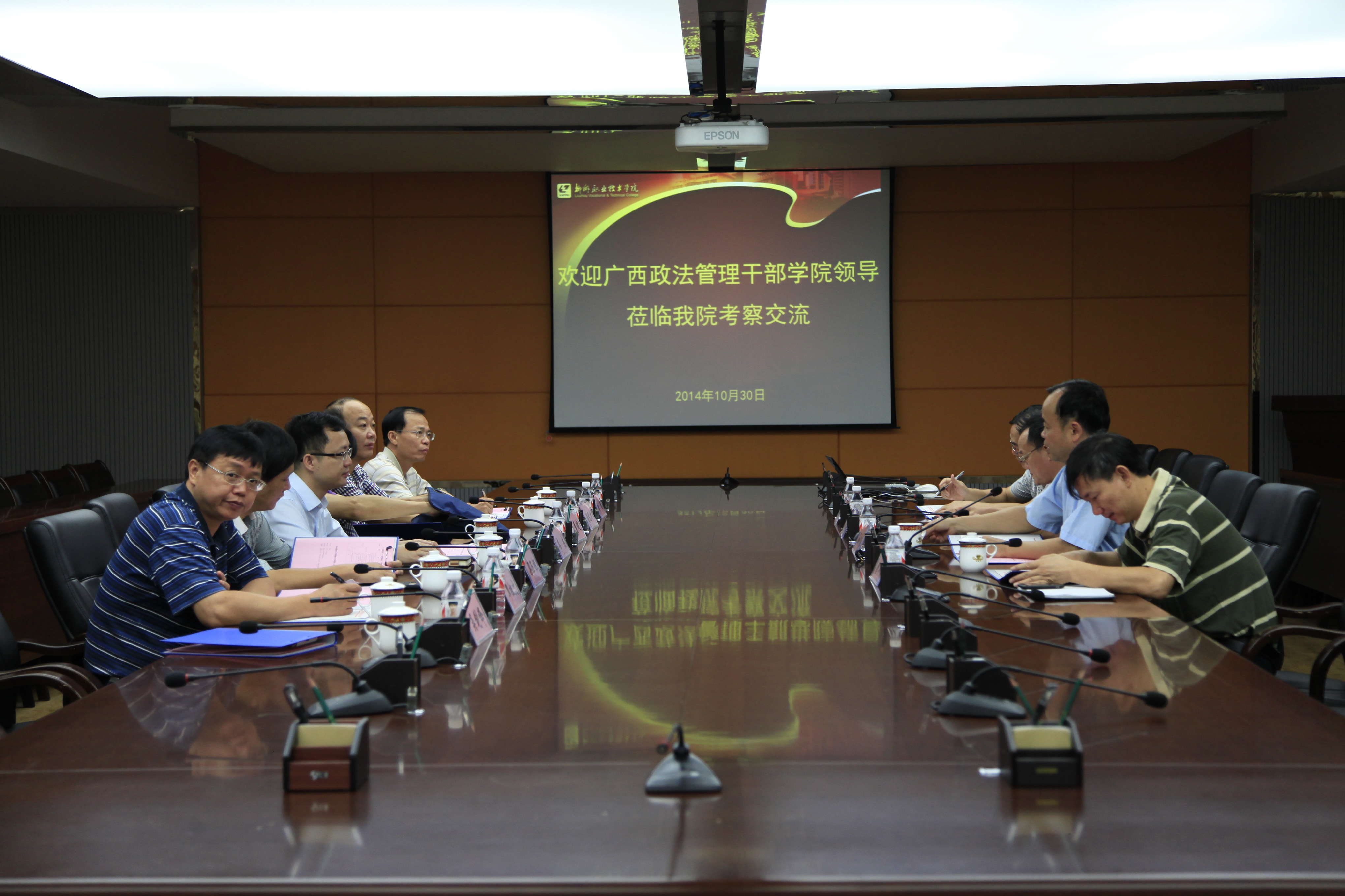 2014年10月30日上午,广西政法干部管理学院院长韦杰一行7人到我??疾旖涣?。学院院长石令明在300会议室与来访客人进行了座谈,交流探讨学校的发展建设与管理等方面问题。学院学工处、教务处及党(院)办负责人参加了座谈。