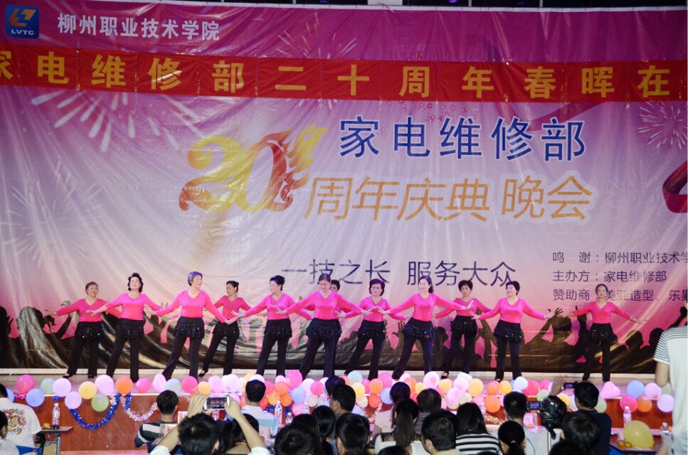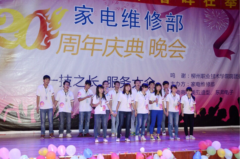 新闻网消息(文/家电维修部 韦灿程、院社团联 苏逢剑 图/宣传部 杨世海) 2014年10月29日晚19:30,由家电维修部主办的主题为“传承20载”的20周年庆典活动在东校区体育馆四楼举行。院团委王慧书记、电子信息工程系韦小波书记、黎晓灵副书记、梁敏、蒙飚等系部指导老师,以及西船社区代表、民泰社区等市内社区领导嘉宾近500人出席了当天活动。
