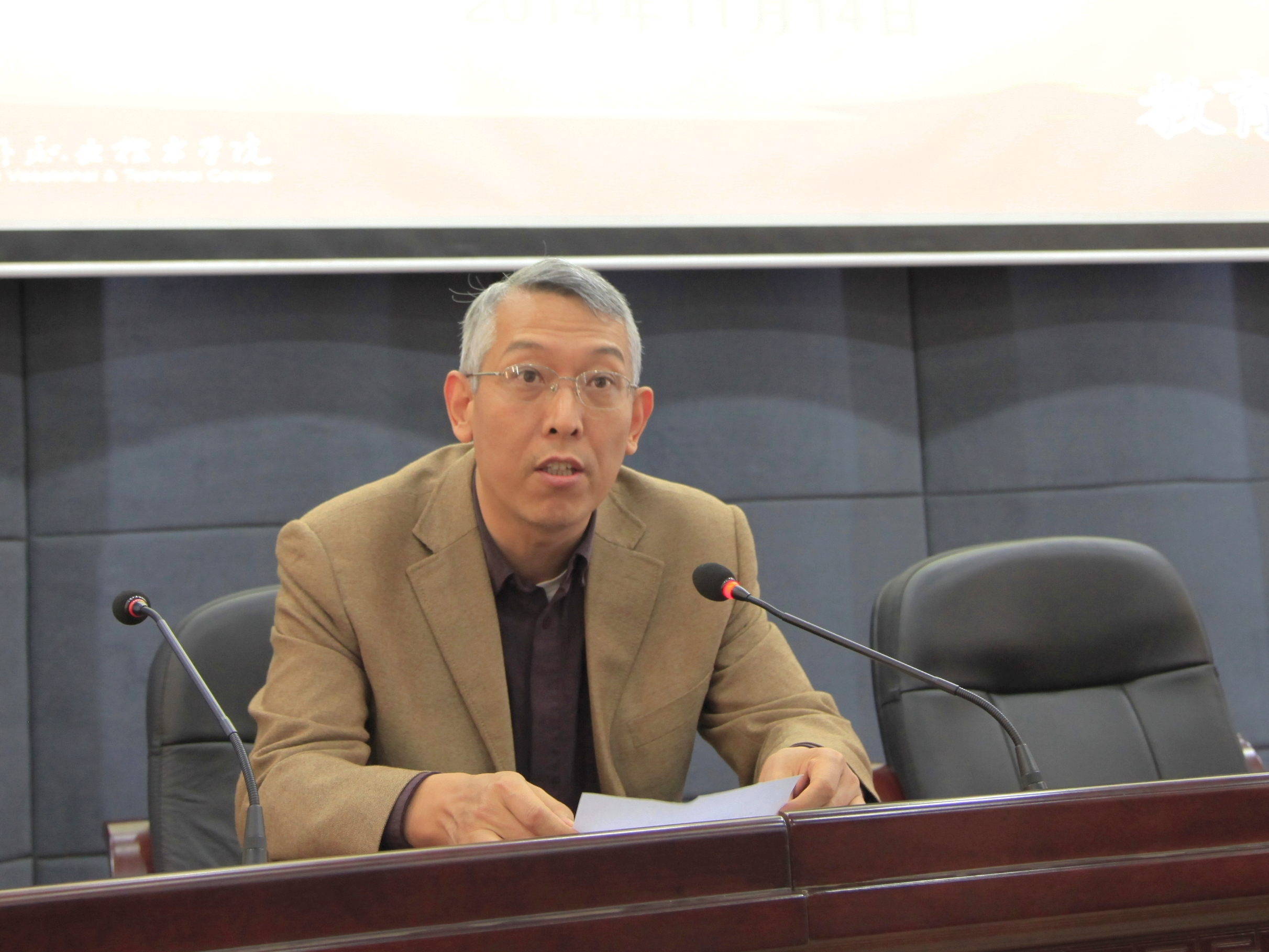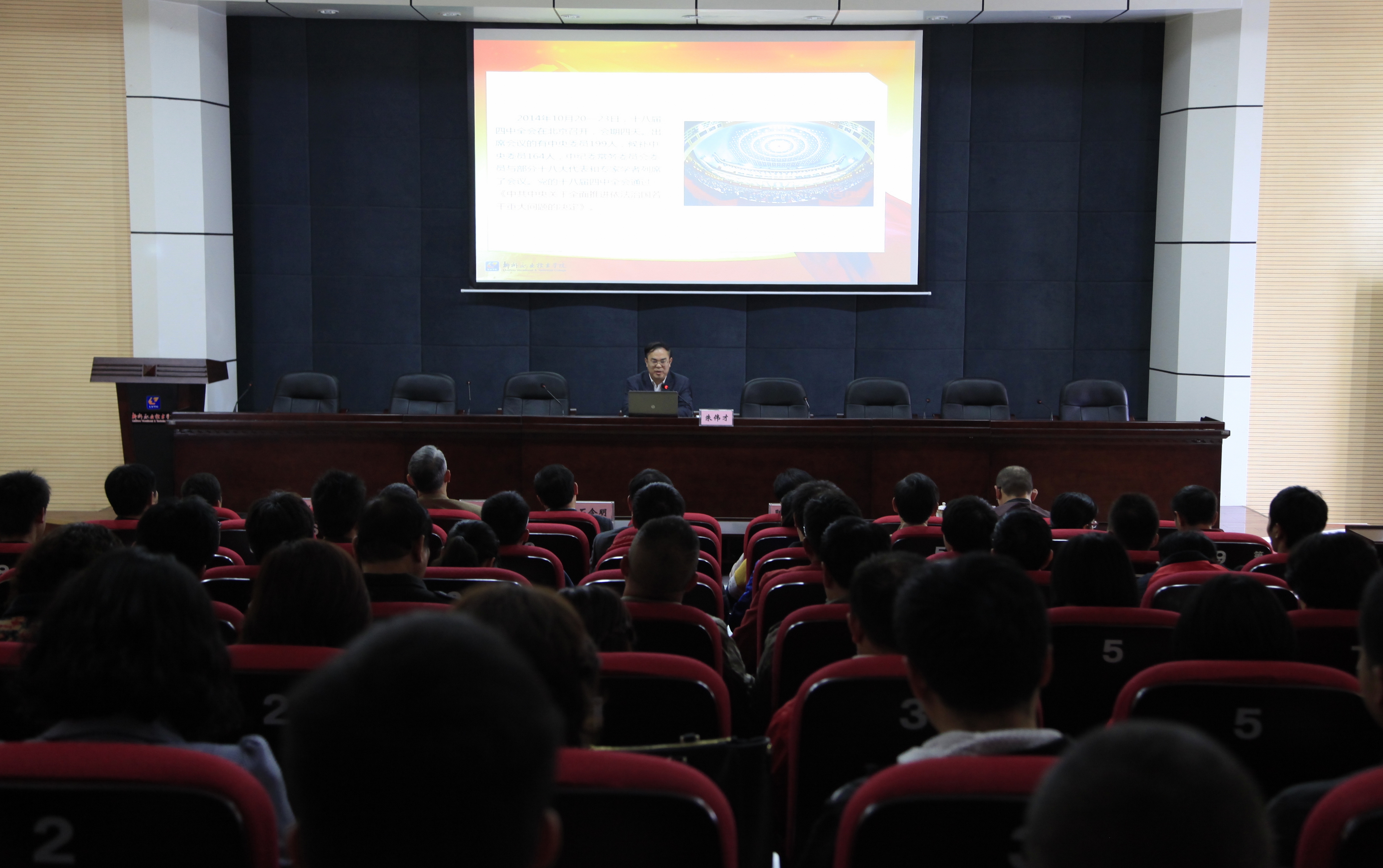 新闻网消息:(通讯员 宣传部 古志华 摄影 宣传部 朱敬民)2014年11月14日下午,我院党委中心组召开学习(扩大)会议,专题学习党的十八届四中全会精神,党委书记朱伟才做了题为《开启依法治国新征程》的辅导报告。学院领导石令明、阳旭、杨毅、瞿凡,院长助理敬志轩,全院科级以上干部及学生代表共170人参加了报告会。报告会由副院长杨毅主持。