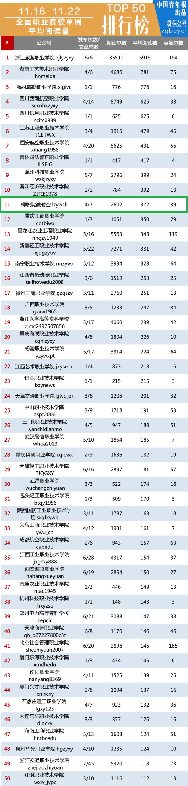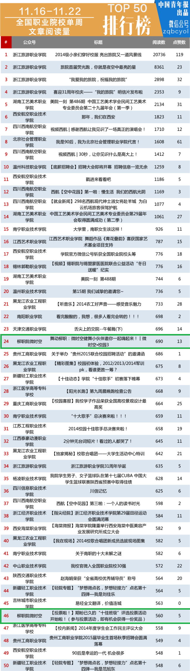 此外,在中国青年报本周同时发布的全国职业院校单周文章阅读量排行榜TOP 50榜单上,《舞动柳职:微时空健舞小伙伴邀你一起嗨起来!︱微时空?校园》和《投票啦!期盼已久的十佳班级投票活动开始啦》也榜上有名。