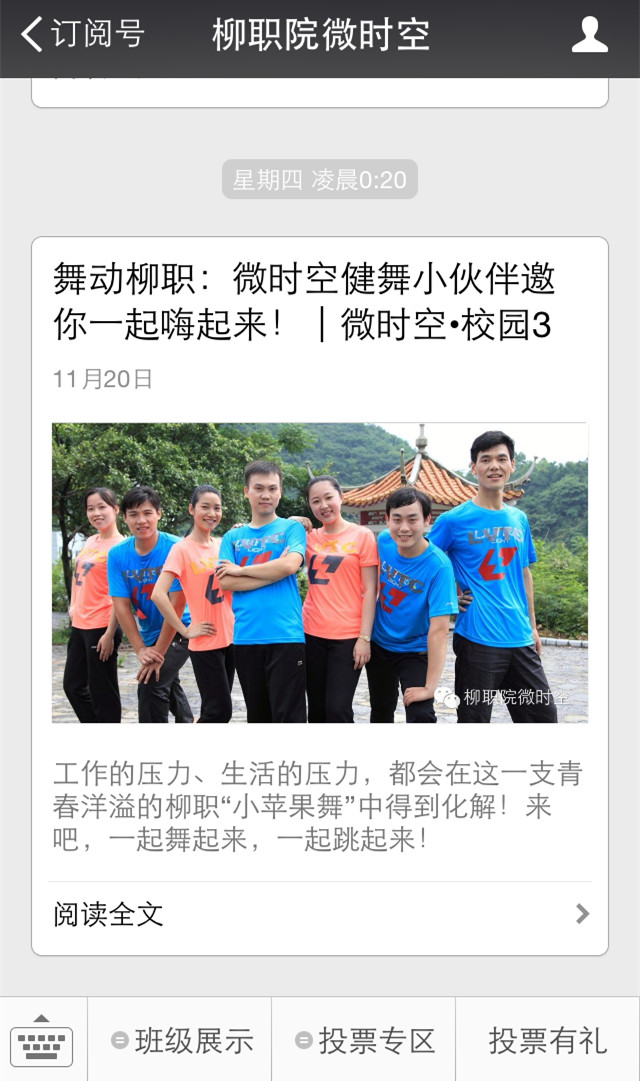 其次,利用固定按钮版块实现深层次服务学院学生管理、思想教育及招生就业工作的功能。如最近,学生工作部利用微信平台开展的“十佳班级”微信平台投票活动就是一例。还有在招生期间及日常发布的各类招生资讯,也较好地实现了微信平台服务考生、家长的重要功能。