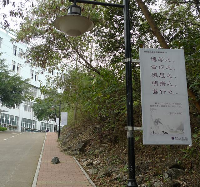 为进一步深化校园文化内涵建设,打造精致化校园,在学院领导的大力支持下,宣传部精心策划组织,后勤与资产管理处积极配合实施,在校园A区和D区的校园道路路灯杆上安装制作了50余幅路灯灯杆旗,以此作为加强校园文化建设、营造良好育人环境的一个载体。首期内容以“培育和践行社会主义核心价值观”为主题,展示了习近平总书记今年5月4日在参加北京大学师生座谈时发表的重要讲话中引用的一些传统文化经典语句及释义。此外,还展示了包括学校办学特色、办学理念、学院精神、校训、校风、教风等在内的学院价值观体系。