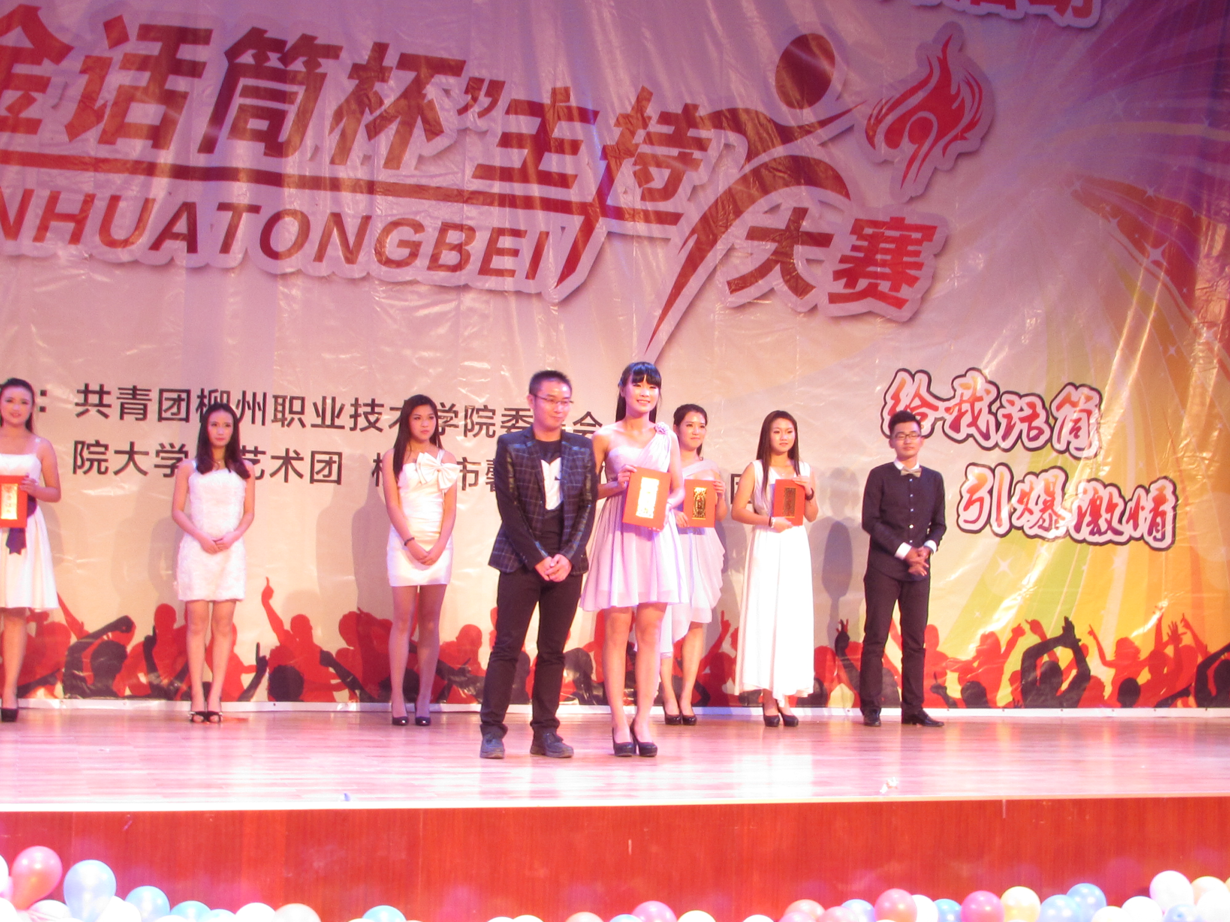 经过激烈的角逐,秦艳秋同学以突出的表现获得三位评委老师的赞赏,高分获得了冠军,龙飞、蒙俊谷同学获得二等奖,唐嘉敏、彭梦琳、严倩娜同学获得了三等奖。院团委老师杨小浒和评委老师给获奖选手颁了奖。