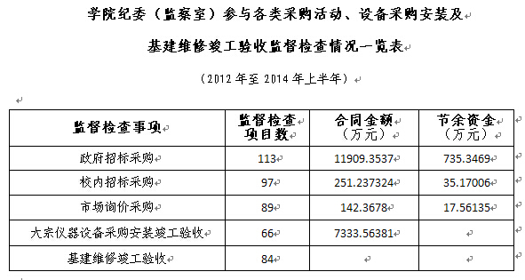 坚持重点领域、关键环节监督检查,加强源头治理。我们组织制定了《柳州职业技术学院纪委、监察室对重点领域(关键环节)监督检查暂行规定》,坚持对学院“三重一大”事项决策、党院务公开、各类收费项目、政府奖(助)学金使用管理、教材征订、招生、招聘、公招录用、职称申报、干部提拔任用等方面的工作实施监督检查,确保其依法依规运作。坚持对学院各类采购活动和各类设备采购安装、基建维修竣工验收进行全程监督检查,既保证了公平、公正、公开,又有效防止了腐败行为发生,同时还为学院节余了宝贵的建设资金。