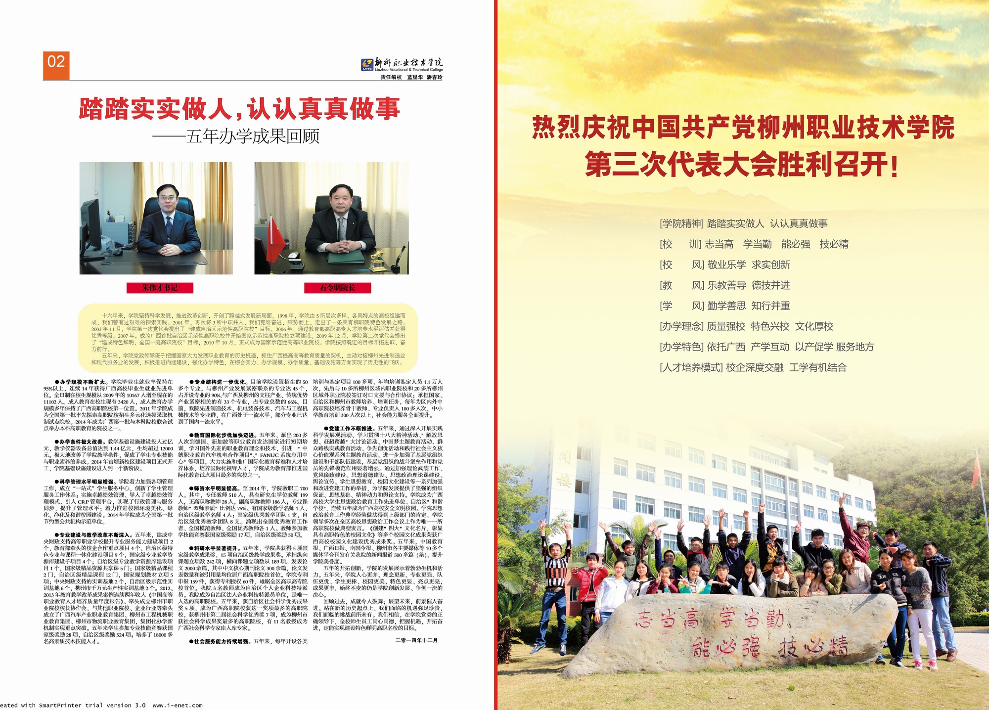 让我们走近校报特刊,去细细体验和感受柳职院一步一个脚印的坚实步伐。预祝中国共产党柳州职业技术学院第三次代表大会圆满成功!祝柳职院的明天更美好!祝我们每一个人越来越幸福!