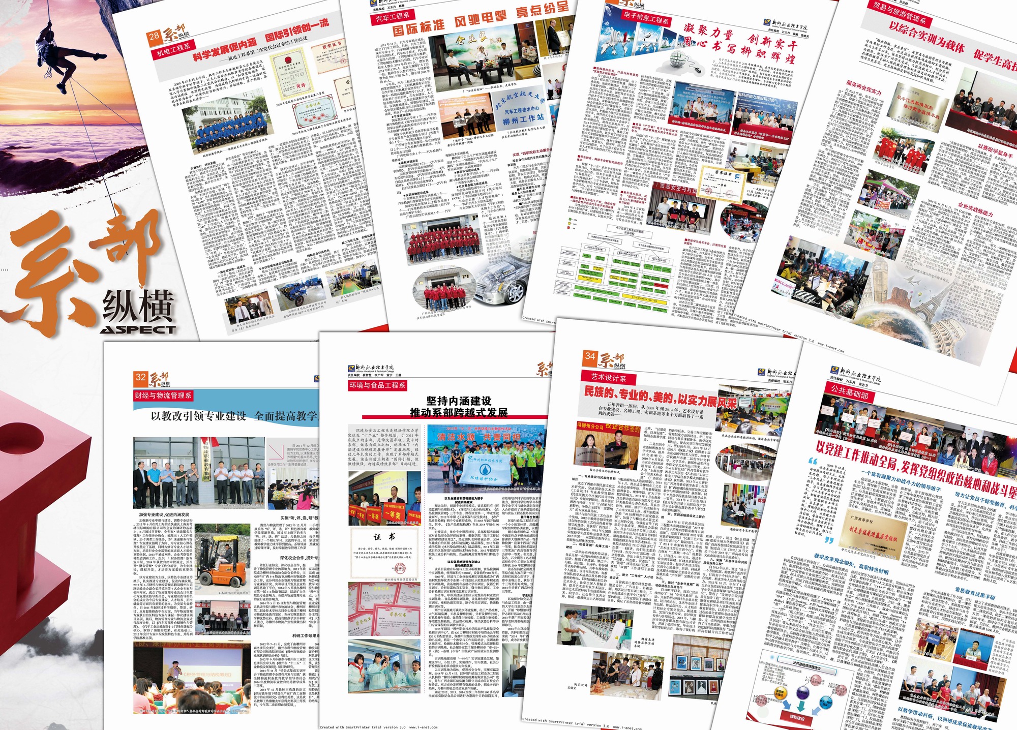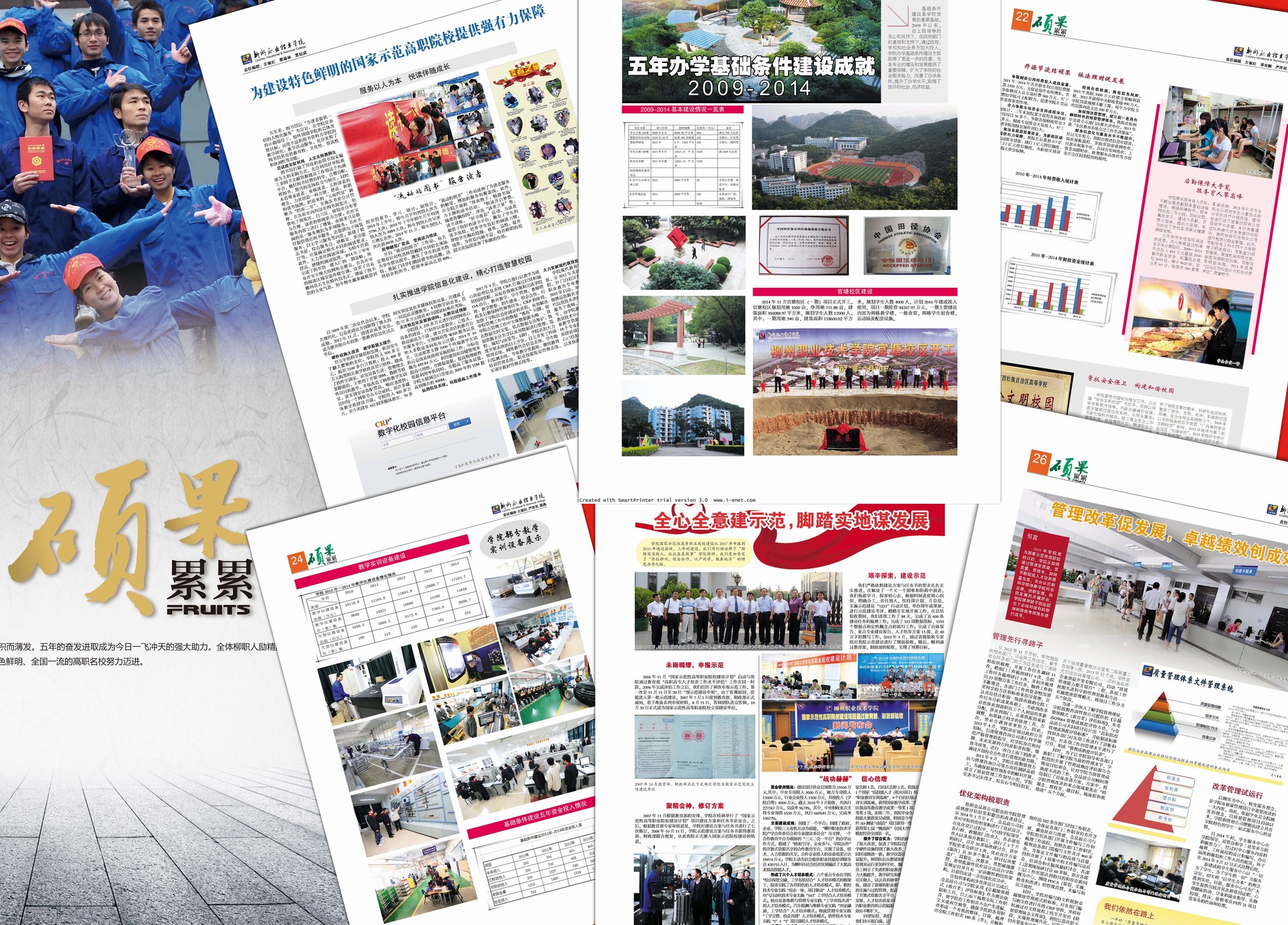 特刊封面是大气磅礴的新校区建设规划图,打开校报特刊,设计精美、制作精良的画页直入眼帘,共分为思源致远、硕果累累、系部纵横、人物撷英、憧憬未来、大美柳职以及深深祝福七大版块?!八荚粗略丁逼跃蔡坊匾舻氖咏?,对学院五年来取得的荣誉、第一次和第二次党代会进行了深情回眸;“硕果累累”篇以18个版的篇幅,纵情讴歌了党建、教学改革、师资队伍建设以及文化厚校等工作取得的不俗业绩;“系部纵横”篇精彩回放了8个教学系部的教育教学改革成就;“人物撷英”篇对我院五年来涌现的优秀教师代表的先进事迹进行了一次集体放歌;“憧憬未来”篇呈现的是未来五年学院的宏畴伟略以及全体柳职人向着创建特色鲜明、全国一流高职名校的美好愿景一路飞奔的美好画面;“大美柳职”篇以3个漂亮的版面,把学校的美景、莘莘学子在校园里学习生活的片断以及办学国际化的实训基地温馨定格;“深深祝福”篇,逾百名柳职学子以各种方式倾诉了对母校的款款深情……