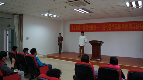 新闻网消息( 通讯员/图书馆刘静春、月亮山文学社蔡艳香 图/图书馆 邓奕军)4月10日下午3点30分,以“春之絮语.阅读悦美丽”为主题的系列读书活动在图书馆三楼多功能厅拉开了序幕。作为系列读书活动之一的“春之絮语.阅读悦美丽--现代爱情诗歌朗诵会”的前奏,“春之絮语——现代爱情诗歌朗诵辅导讲座”亦正式开讲。本次讲座还请来了原广西交通台节目主持人、广西普通话形象大使、柳州语言表演艺术学会副会长童瑶老师为同学们主讲。来自各系的诗歌朗诵爱好的同学们兴致勃勃地参加了讲座。