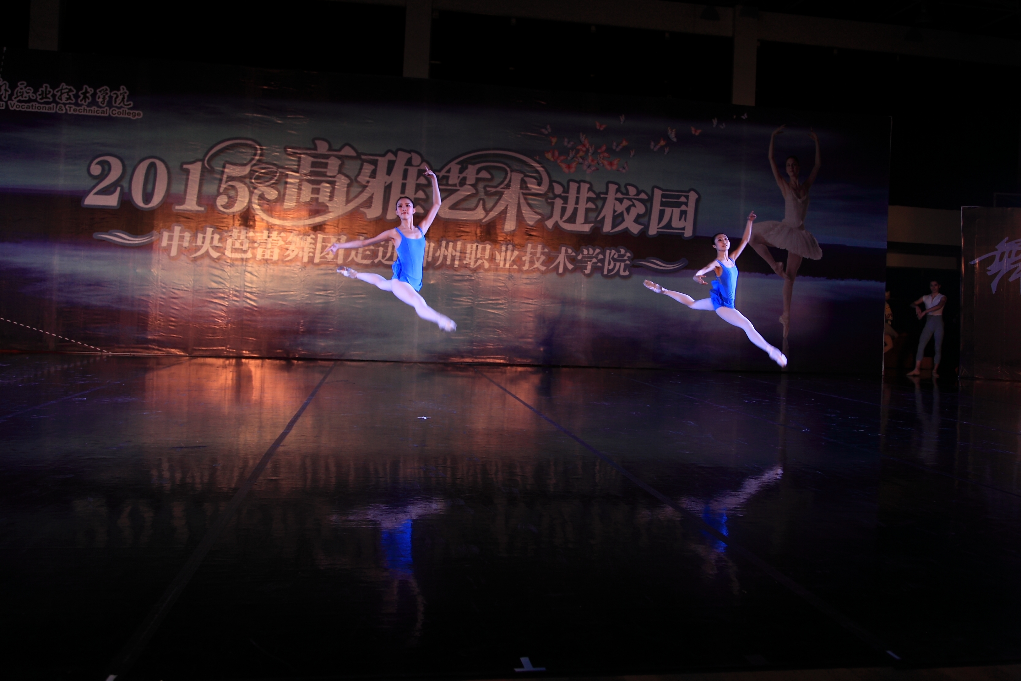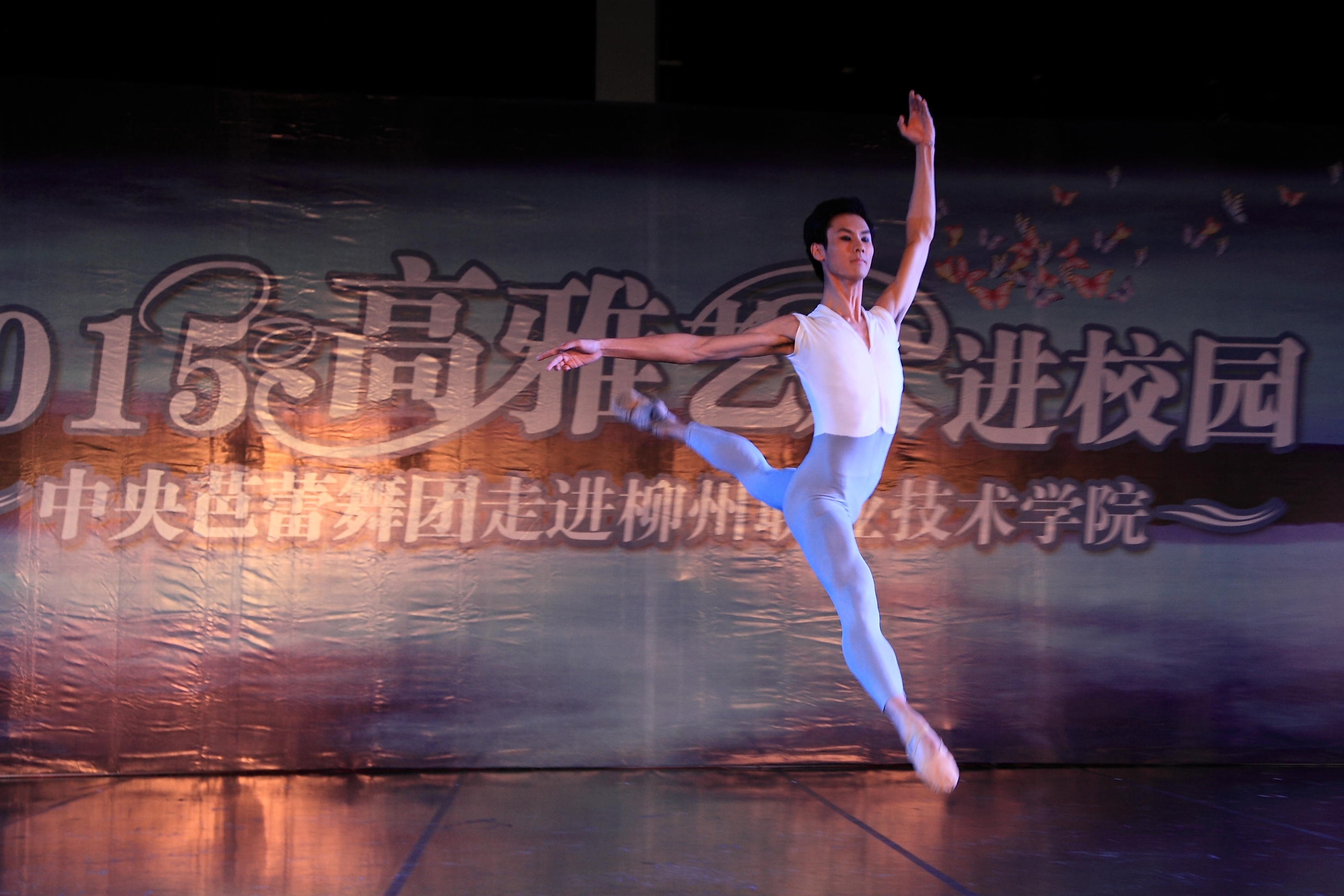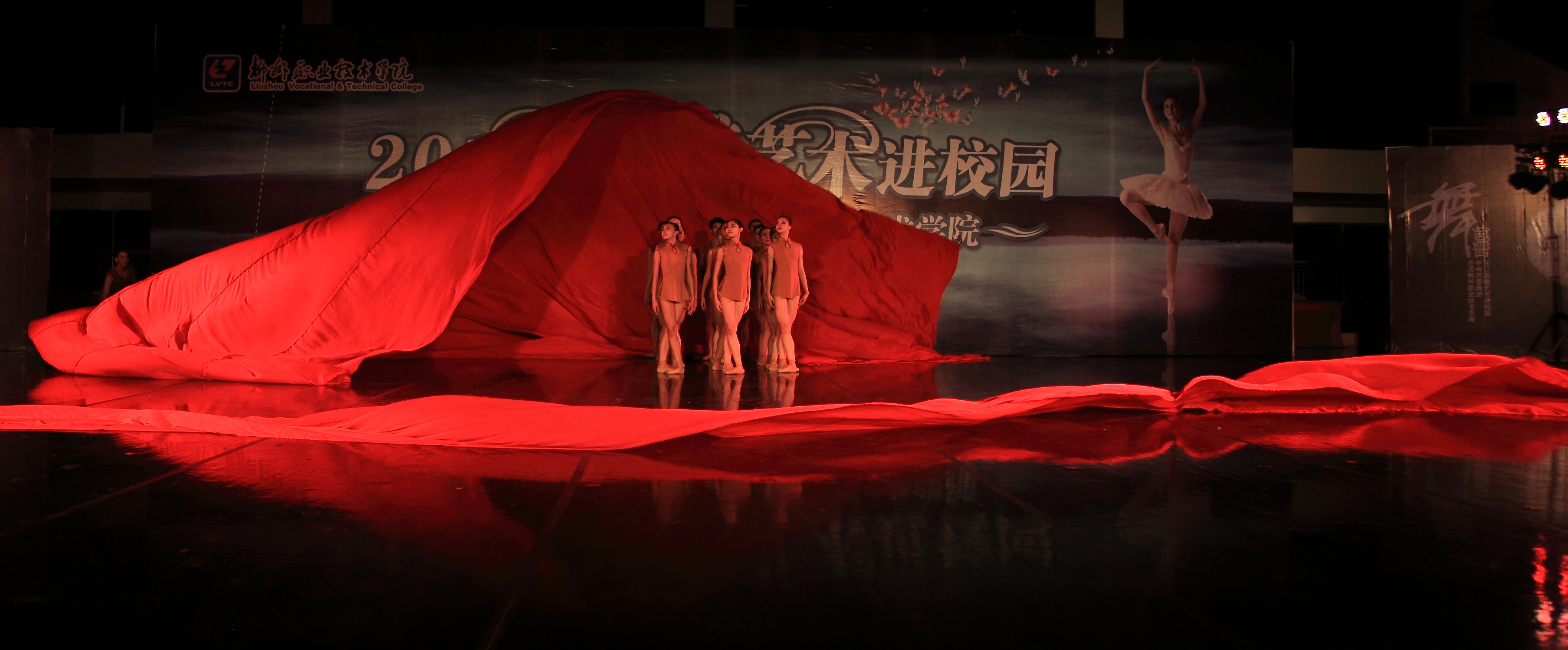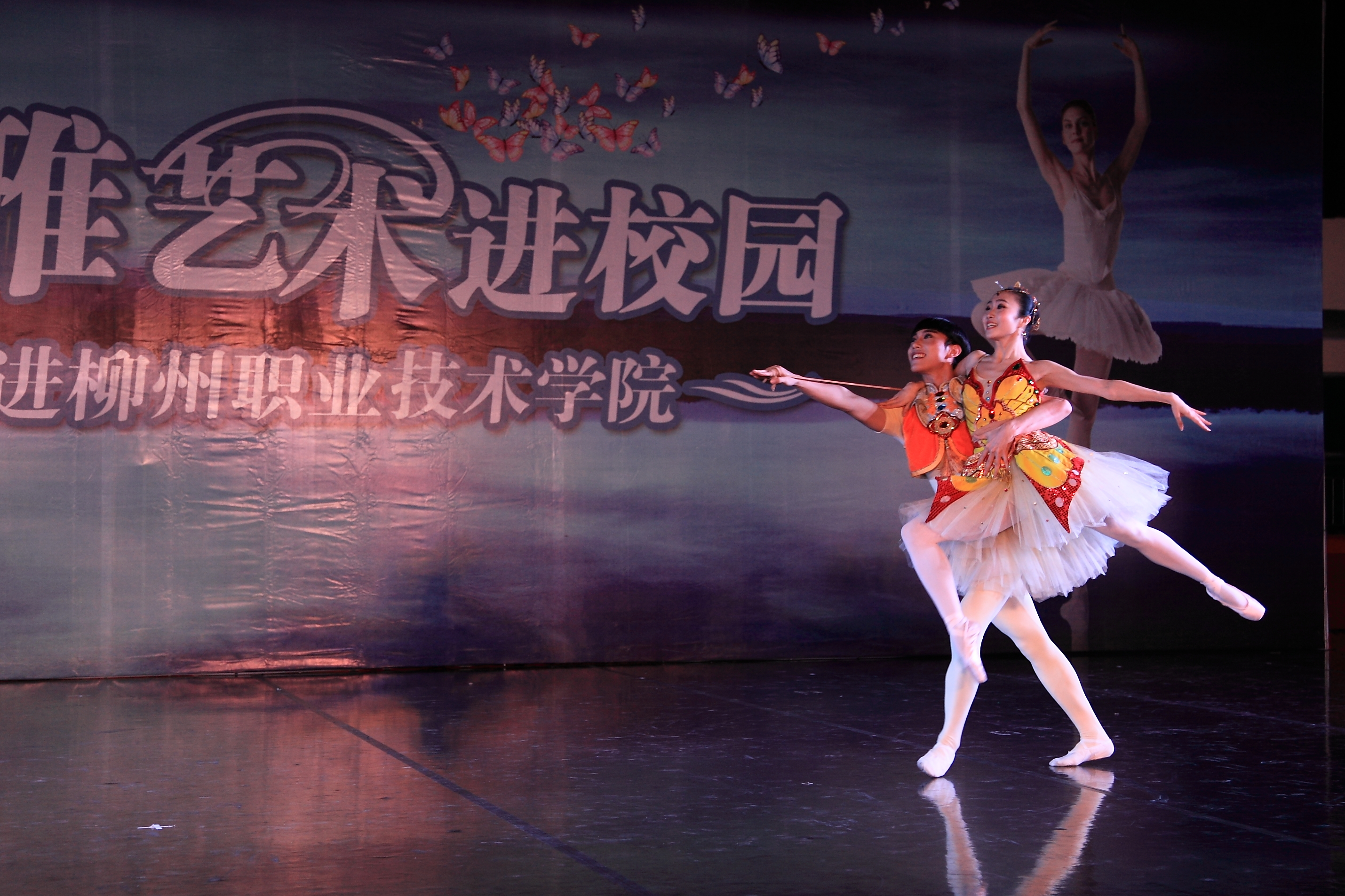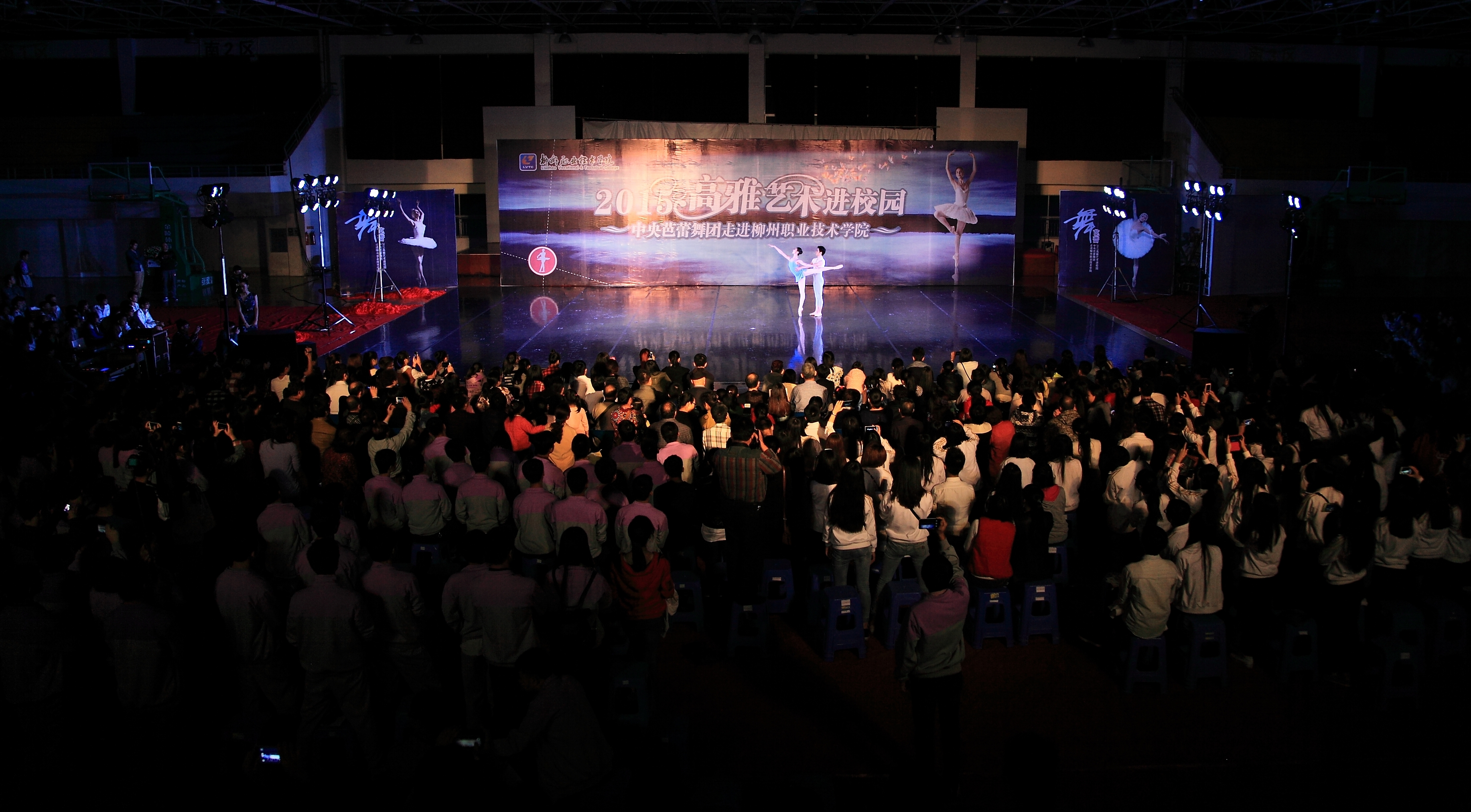当晚4名少女简短的开场舞后,我院党委书记朱伟才讲话,欢迎远道而来的中央芭蕾舞团的演员们。该团是我国最高级别的艺术团体,多年来,致力于传承和传播高雅的艺术和文化,奠定了自身在行业中的地位。作为全国100所、广西仅2所的柳职院,在发展过程中,也以严谨的治学精神和办学理念在自己独树一帜的办学道路上执着追求,同样奠定了自己在全区乃至全国的地位。此次高雅艺术进校园活动,是艺术与教育的一次握手,将在我院校园文化史上留下深刻的印记,祝愿大家度过一个美好的夜晚!