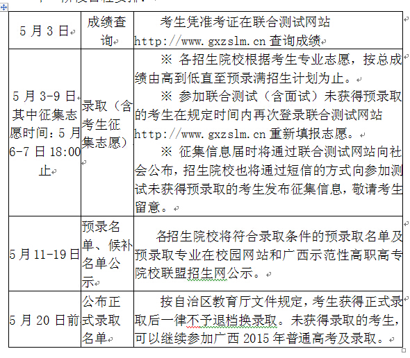 需要提醒考生的是:按自治区教育厅文件规定,同时参加南职、柳铁及13校联考的考生,若同时录取,志愿以广西招生考试院为准??忌竦谜铰既『笠宦刹挥柰说祷宦既⊙?。未获得录取的考生,可以继续参加广西2015年普通高考及录取。