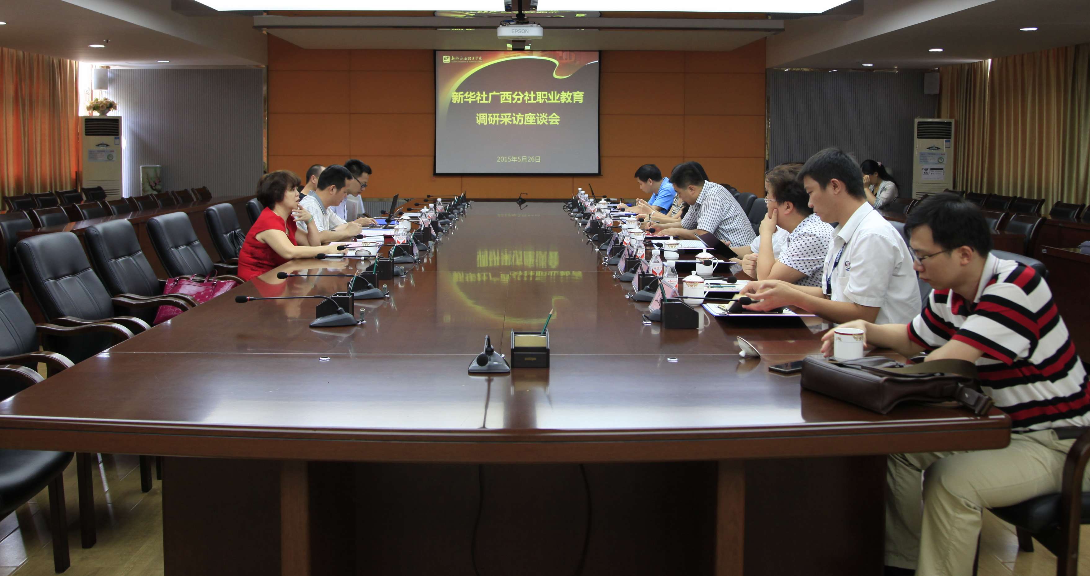 新闻网消息(记者/石玉丹 摄影/朱敬民)5月26日,新华社广西分社调研组一行4人到访我院,调研组成员有新华社社长孙志平、新闻信息中心副主任陈菊琪、社会部(桂中采访中心)主任李斌、记者汪军。当日下午,在我院300会议室召开了有柳州市教育局副局长潘旭阳、我院院长石令明以及铁道职院、城市职院、一职校、二职校、上汽通用五菱、柳工路创等单位代表出席的调研采访座谈会。