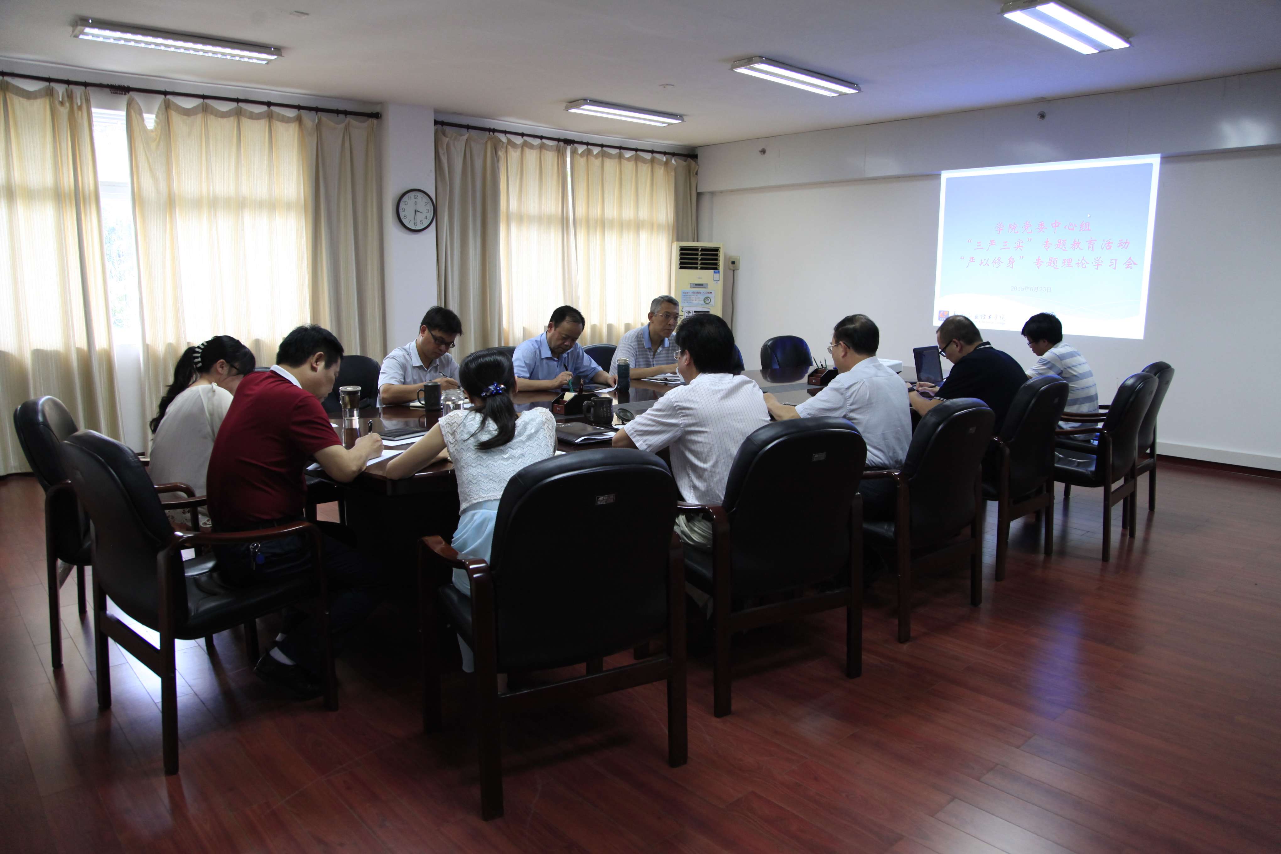 新闻网消息(记者/蓝星华 图/朱敬民)6月23日下午,按照学院党委关于“三严三实”专题教育的安排,学院党委中心组召开“三严三实”专题教育“严以修身”专题学习会?;嵋橛裳г旱澄榧?、党委中心组组长朱伟才主持。学院党委中心组成员石令明、阳旭、杨毅、瞿凡、冉福松、左妮红、韦林出席会议。