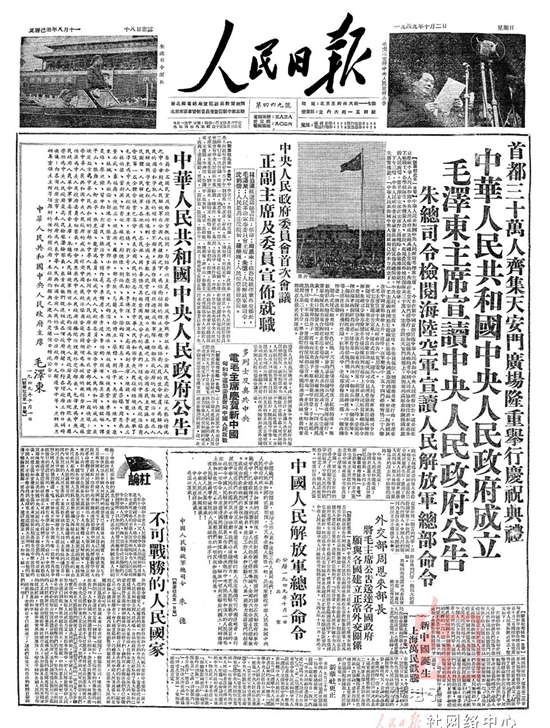 1949年10月1日,首都北京30万军民齐聚天安门广场,隆重举行开国大典,并进行阅兵式。毛泽东主席在天安门城楼向全世界庄严宣告中华人民共和国成 立,并亲手升起中华人民共和国国旗——第一面五星红旗??蟮湓谋娇己?,中国人民解放军总司令朱德在阅兵挥聂荣臻的陪同下,乘敞篷汽车检阅了陆 海总指空三军受阅部队。