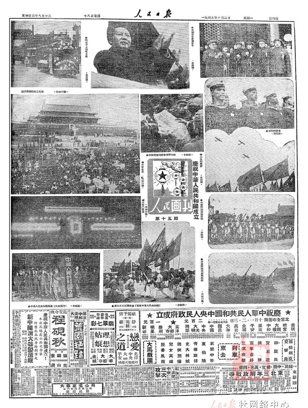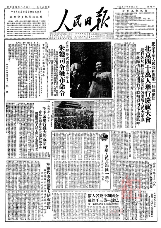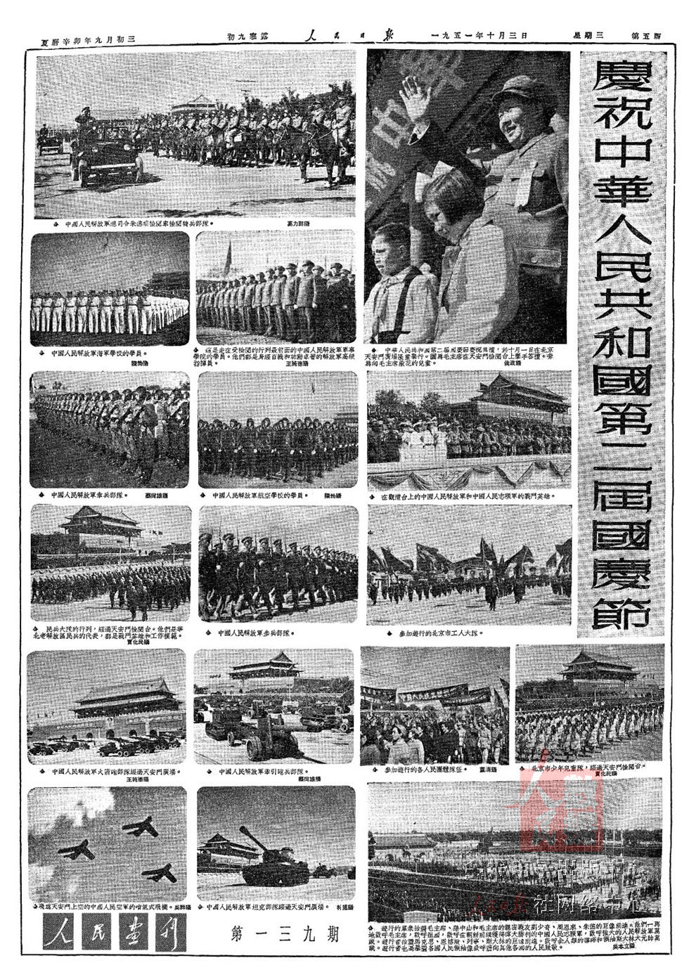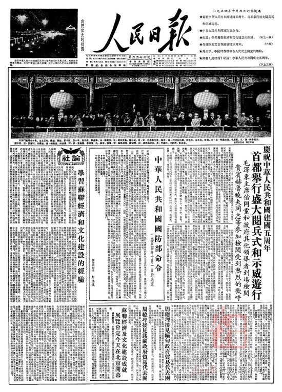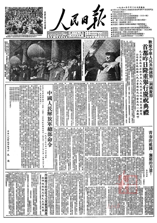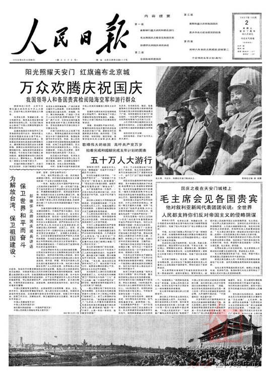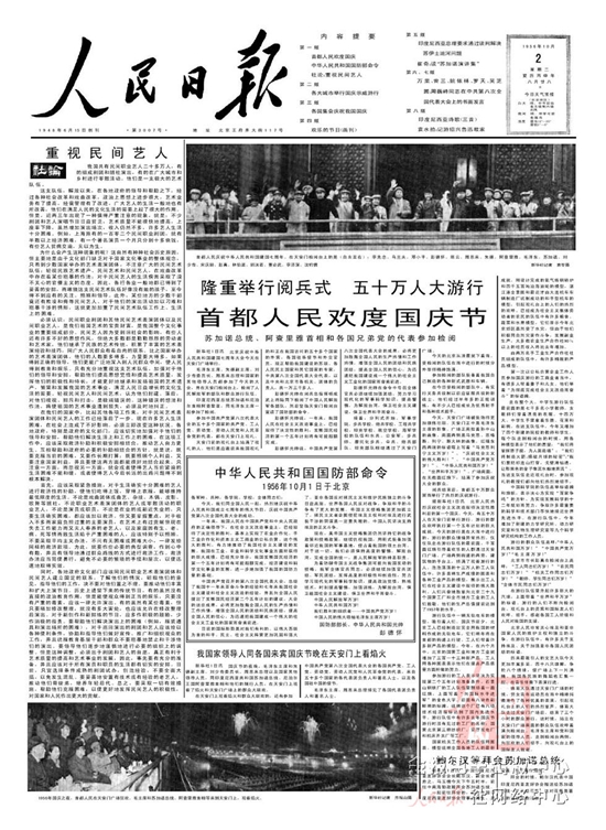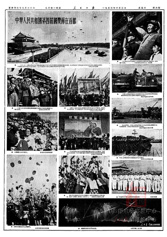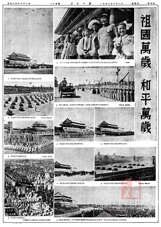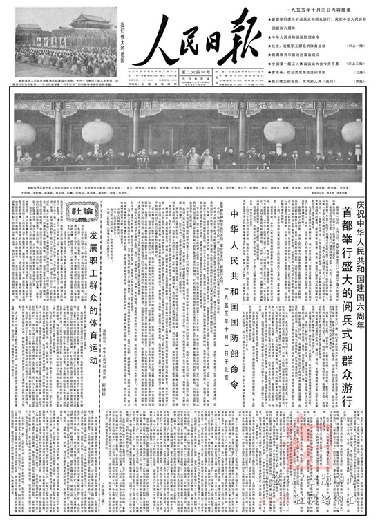 1952年10月1日国庆三周年,人民解放军陆??杖兔癖?1300多人接受了检阅。公安部队首次参加国庆阅兵。来自全国10多个民族的民兵参加受阅。