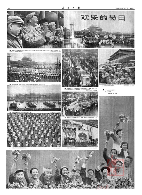 1956年10月1日国庆阅兵,是新中国成立后第八次国庆阅兵。人民解放军陆??杖慷哟?1929人组成29个方队接受检阅。这次阅兵是在雨中受阅。人们渴望见到的国产喷气式飞机,因下雨未能受阅。这次阅兵,受阅官兵第一次乘坐国产的“解放”牌汽车受阅。