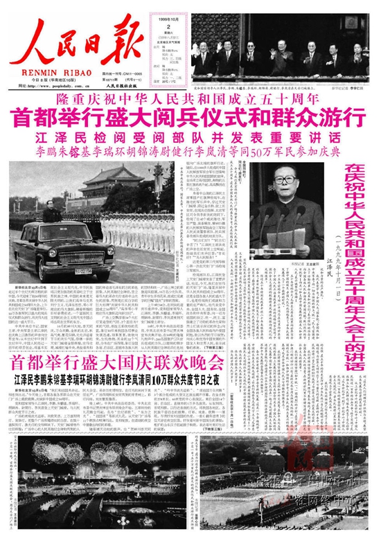 1999年10月1日,走过半个世纪光辉历程的新中国,迎来了她50周年的庆典。首都各界庆祝中华人民共和国成立50周年大会,上午在北京天安门广场隆重举行。50万各族军民以盛大的阅兵仪式和群众游行,欢庆伟大祖国的这一盛大节日。中共中央总书记、国家主席、中央军委主席江泽民检阅了受阅部队。