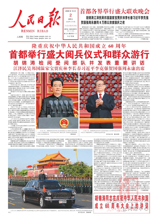2009年10月1日,首都各界庆祝中华人民共和国成立60周年大会在北京天安门广场隆重举行,20万军民以盛大的阅兵仪式和群众游行欢庆伟大祖国的这一盛大节日。中共中央总书记、国家主席、中央军委主席胡锦涛检阅了受阅部队。