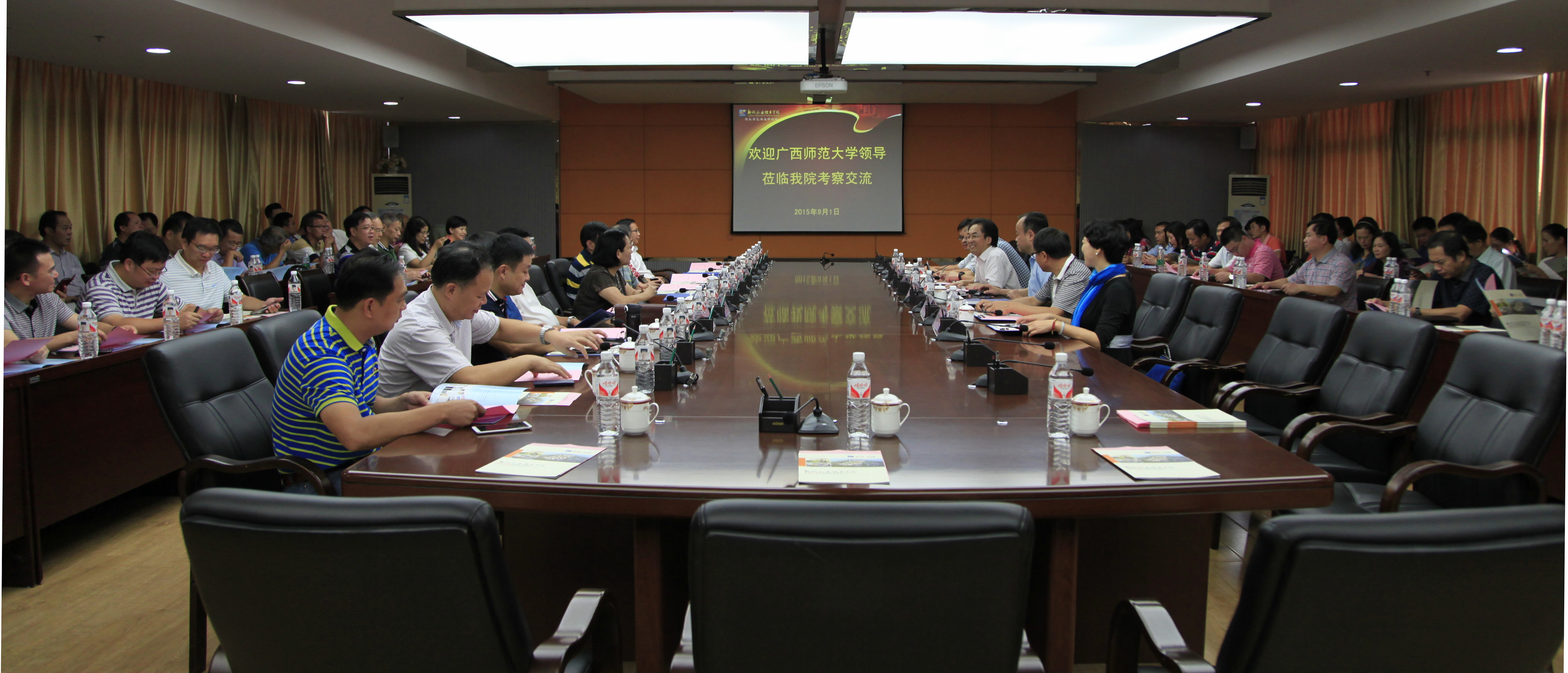新闻网消息(通讯员/院办 黄俊 图/朱敬民、廖宏宇)2015年9月1日上午,广西师范大学党委书记王枬、校长梁宏率该校全体中层以上干部及各处室门部门主要工作人员等共100多人,到我院考察交流。学院领导石令明、阳旭、林若森、瞿凡、鞠红霞、冉福松等,在行政楼300会议室,与广西师范大学客人们进行了座谈与交流。