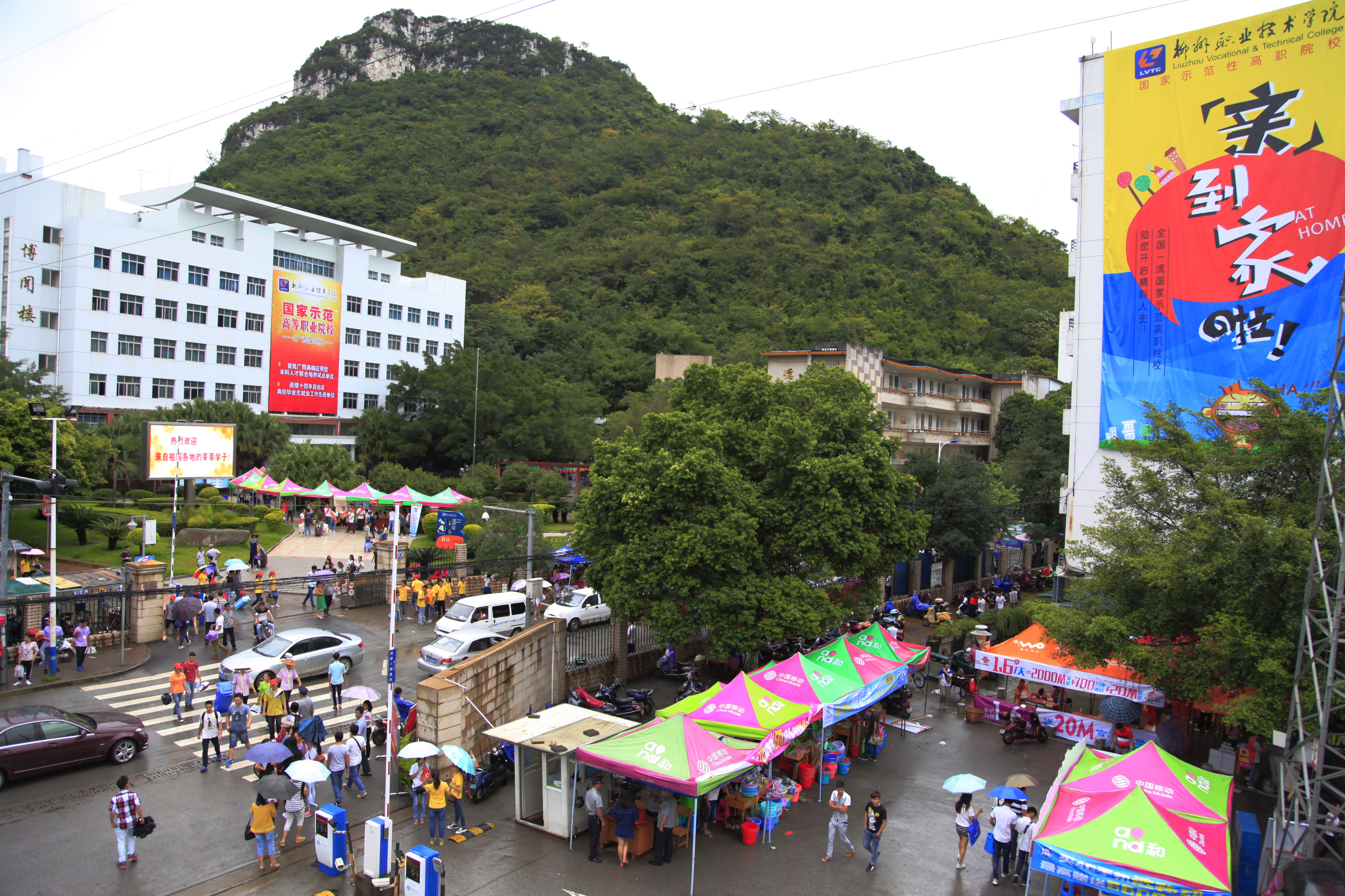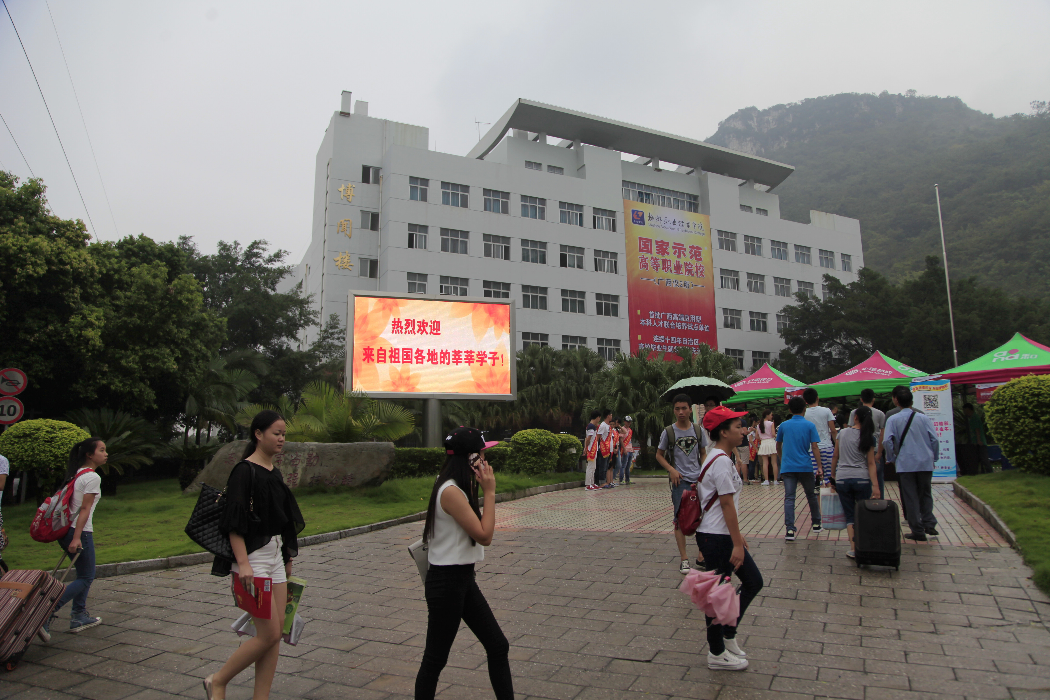 伫立校门,远远地就可以看见“亲,到家啦!”的温暖而亲和的巨幅欢迎词,以黄、红、蓝配色为底,非常打眼;博闻楼墙面上高悬着的巨大旗帜,继续它橘黄加大红的“西红柿炒鸡蛋”鲜艳夺目的配色,上书“国家示范高等职业院校(广西仅两所) 首批广西高端应用型本科人才联合培养试点单位、连续14年自治区高校毕业生就业工作先进单位”的字样,学校的荣誉一目了然,怎么看怎么爽心悦目;巨型电子显示屏上适时滚动播放着不同的宣传内容,“热烈欢迎来自全国各地的莘莘学子!”“新起点,新目标,新挑战,新跨越”“今日柳职学子,明日大国工匠”等多条宣传内容不时刷新您的眼球。