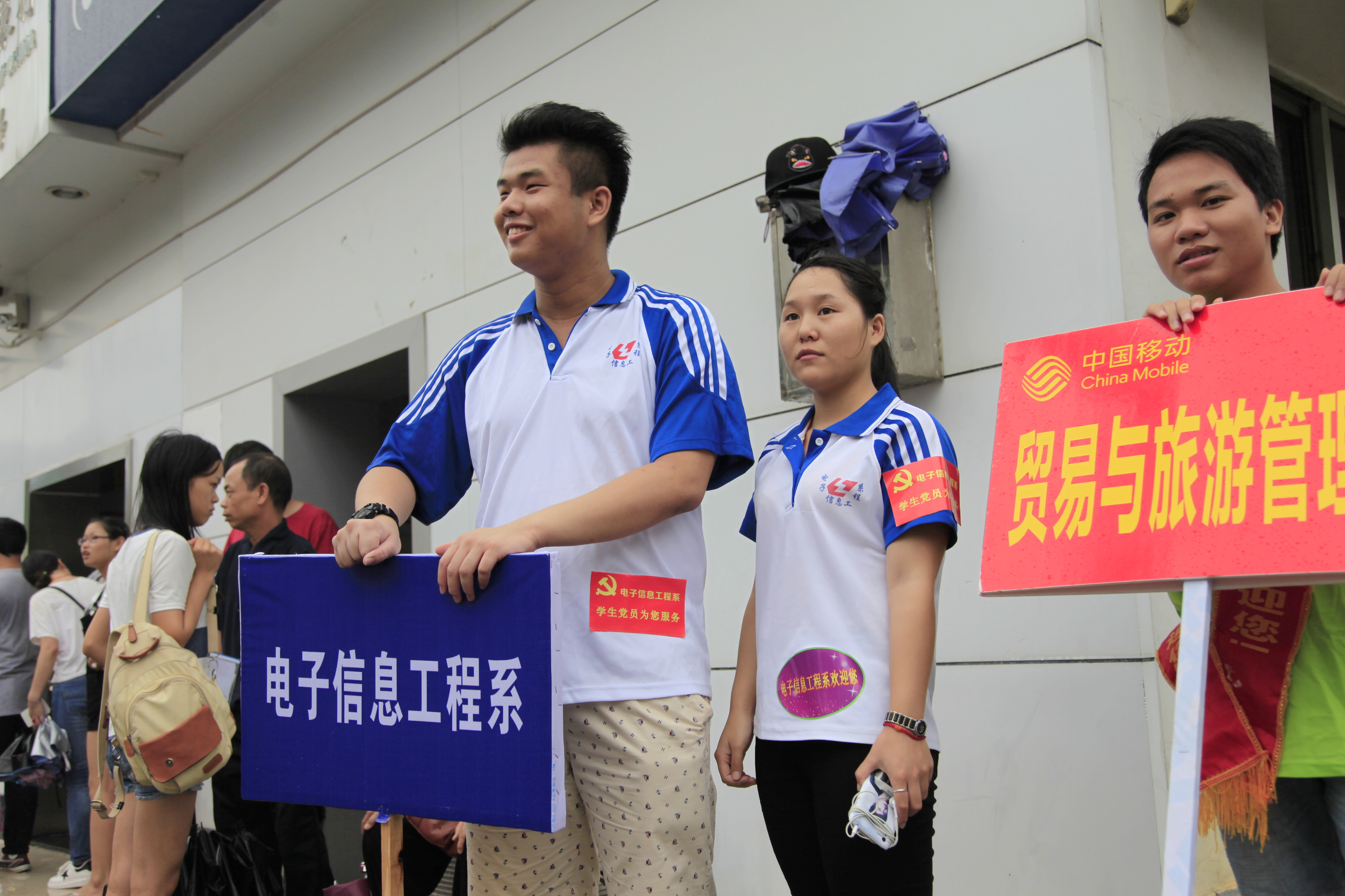 11日下午4点,与行政办公楼挨着的一片开阔地以及博闻楼片的迎新大本营早已经熙熙攘攘车水马龙,迎新志愿者们手持各系部的红色标识牌,伫立在公交车站、路口、校门口以及各个迎新点,一溜烟的彩色帐篷也早已经搭起来,那是各教学系的服务点,也都已经人头攒动。老生帮新生拎行李、新生与家长正在办理报到手续、一部部高大上的迎新公交车驶进驶出……迎新现场以热情有礼、文明有序的氛围喜迎来自全国各地的柳职学子。
