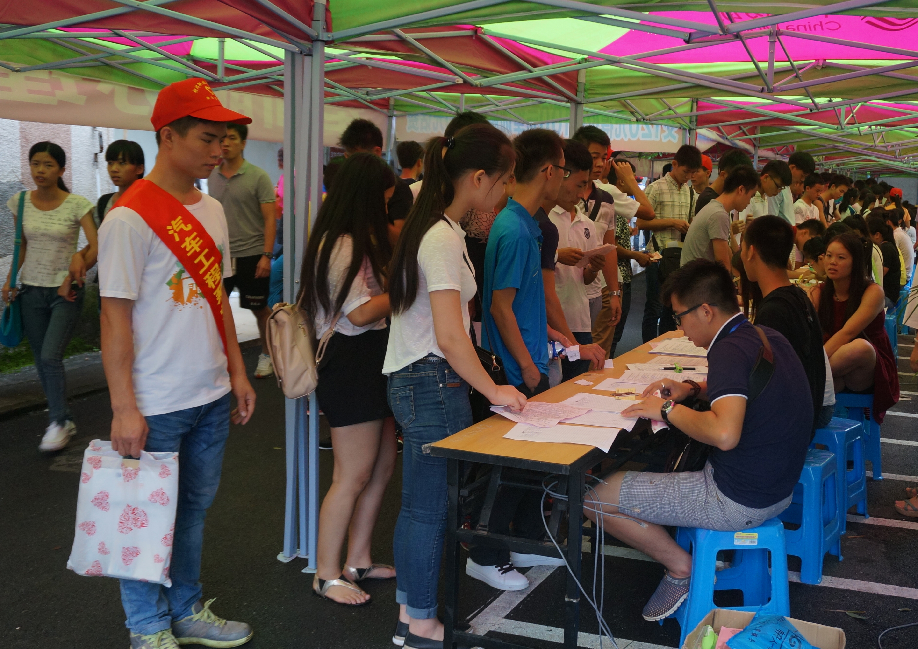 11日下午4点,与行政办公楼挨着的一片开阔地以及博闻楼片的迎新大本营早已经熙熙攘攘车水马龙,迎新志愿者们手持各系部的红色标识牌,伫立在公交车站、路口、校门口以及各个迎新点,一溜烟的彩色帐篷也早已经搭起来,那是各教学系的服务点,也都已经人头攒动。老生帮新生拎行李、新生与家长正在办理报到手续、一部部高大上的迎新公交车驶进驶出……迎新现场以热情有礼、文明有序的氛围喜迎来自全国各地的柳职学子。