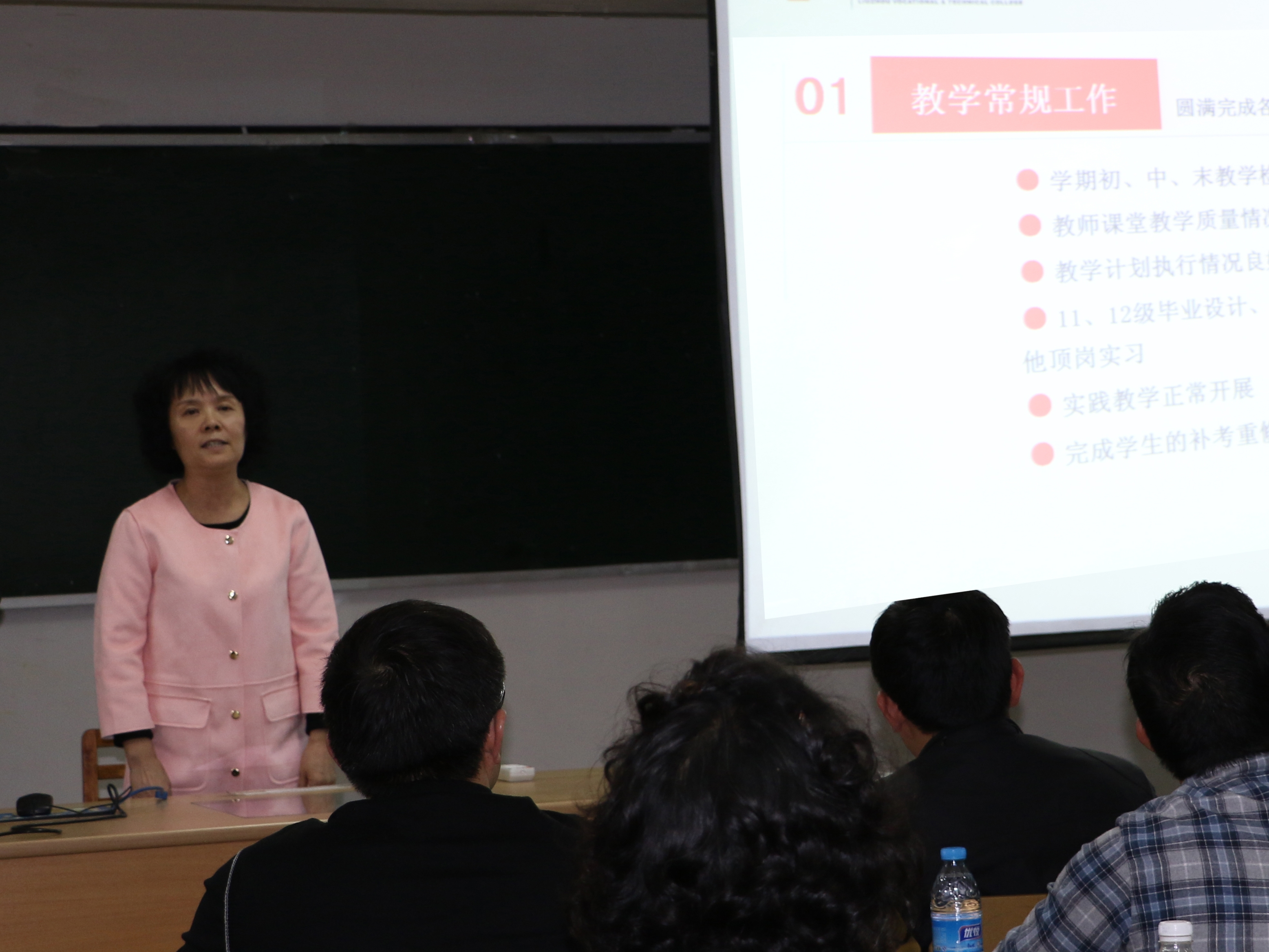 艺术设计系主任佘莉作《盘活现有资源,创新迎接挑战》的教学工作报告,从教学常规管理、专业建设与课程改革、师资队伍建设、实训条件建设、技能竞赛、教改与科研、学生工作、社会服务等方面,回顾了一年来的教学工作,分析了教学工作中存在的主要问题,并提出了下一步工作思路和改进措施。