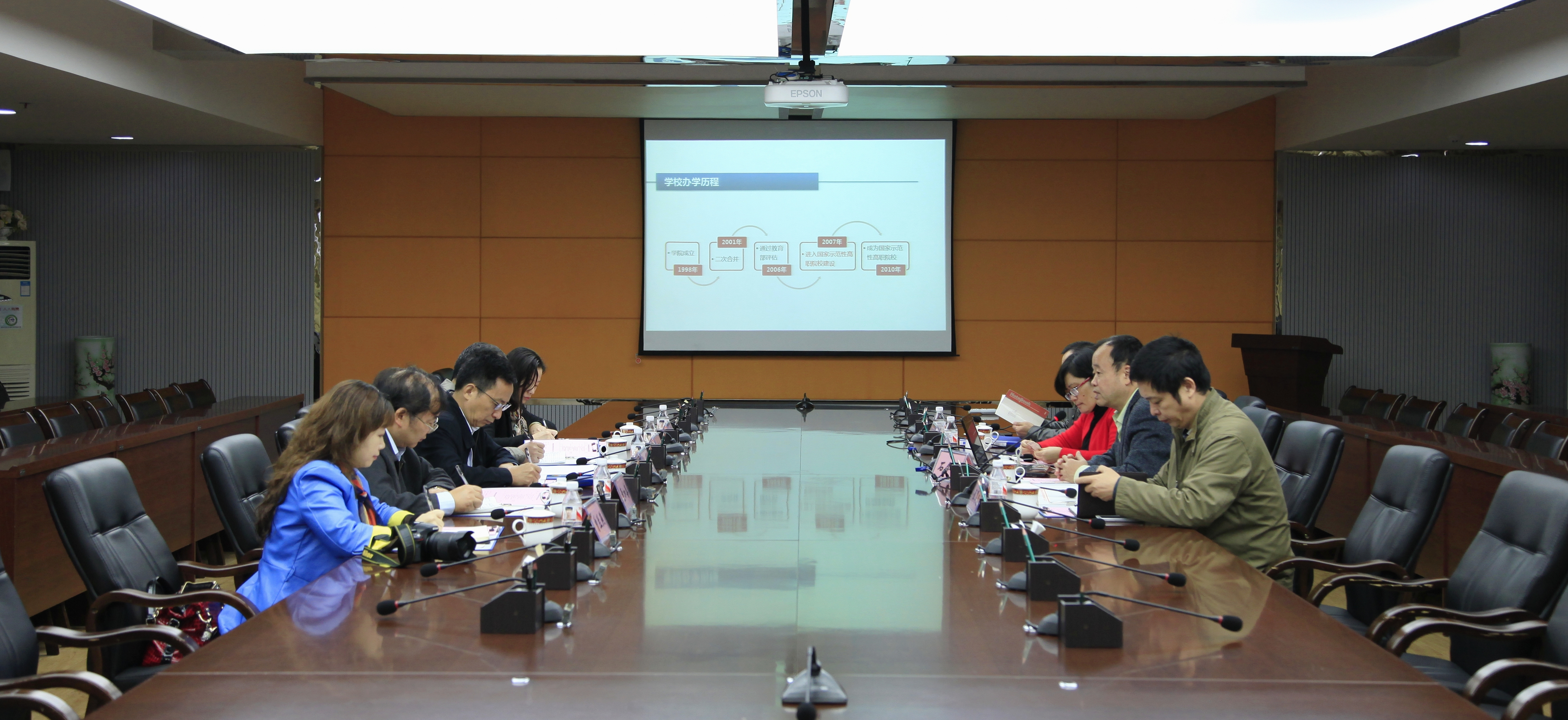随后,宾主双方在行政楼300会议室进行了座谈交流。石院长向广州科技贸易职业学院客人们介绍了学院的发展历程、办学理念与创新思路,特别是在教学改革方面、科技工作、团队建设、现代管理等方面的具体做法和体会,以及未来学院的“国际引领、内涵升级、六化并举,建成特色鲜明的高职名?!钡恼铰阅勘辍J撼ね币脖硎?,希望得到广州科技贸易职业学院好的办学经验并加强交流。