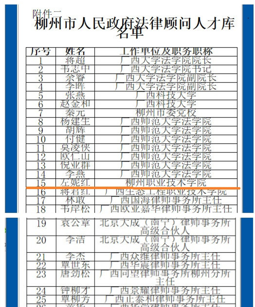 新闻网消息(记者 崔智慧)近日,在柳州市人民政府官方网站上,市法制办发布了关于公布《柳州市人民政府法律顾问人才库管理办法(试行)》和《柳州市人民政府法律顾问人才库成员名单》的公告,39名专家、律师经征集、遴选成为首批法律顾问人才库成员。我院左妮红教授继2010年被柳州市仲裁委员会聘为第五届柳州仲裁委员会仲裁员后,此次又被遴选为柳州市人民政府法律顾问人才库成员。