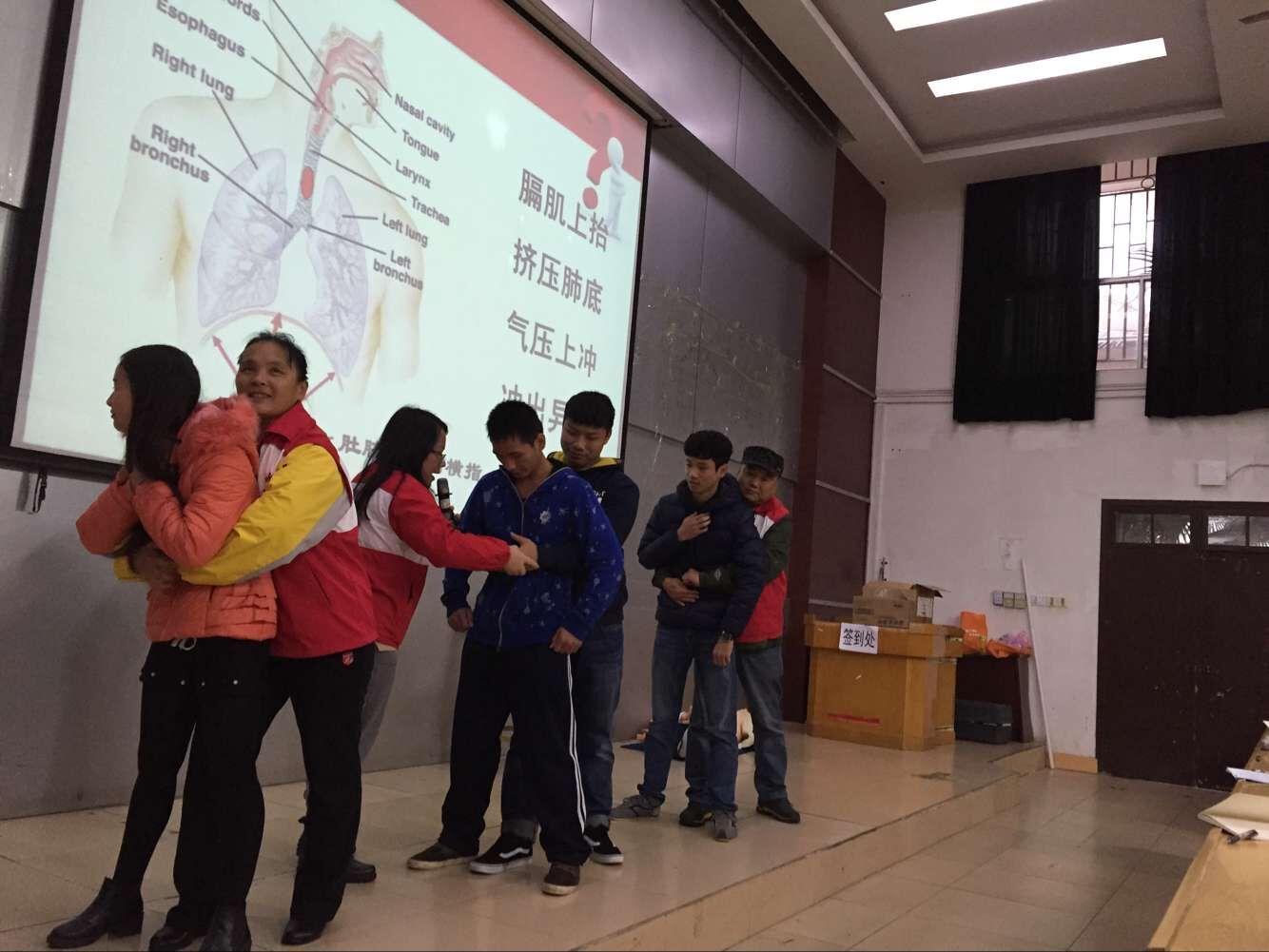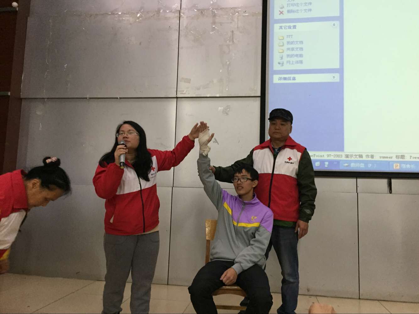 为提高舍长们在突发疾病时自救互救的能力,培训班还邀请到柳州市红十字会罗少云老师的培训团队给大家进行应急救护培训。一个热闹的暖场游戏后,罗老师的开场白“当意外在你身边发生,现场有人受伤,在专业救援人员赶到之前,你知道如何进行正确急救吗?”吸引了同学们的注意。两位老师借助模拟人,重点讲解和演示了心肺复苏术、人工呼吸法、海事急救法、创伤止血包扎法等紧急救护技术。培训中,学员们兴致盎然,踊跃上台参与互动和体验,感叹紧急救护其实就是在和死神赛跑,看似容易和简单,其实不仅需要具备一定的急救常识和技能,同时还要有良好的心理素质和体力。