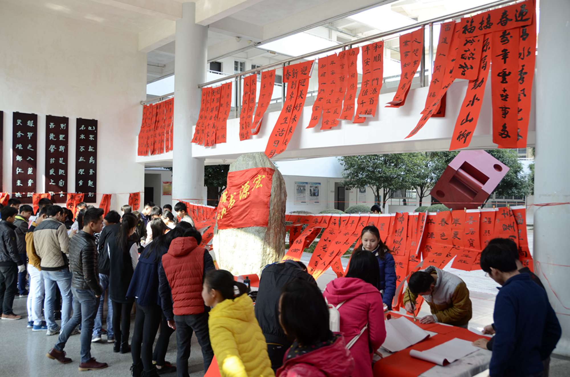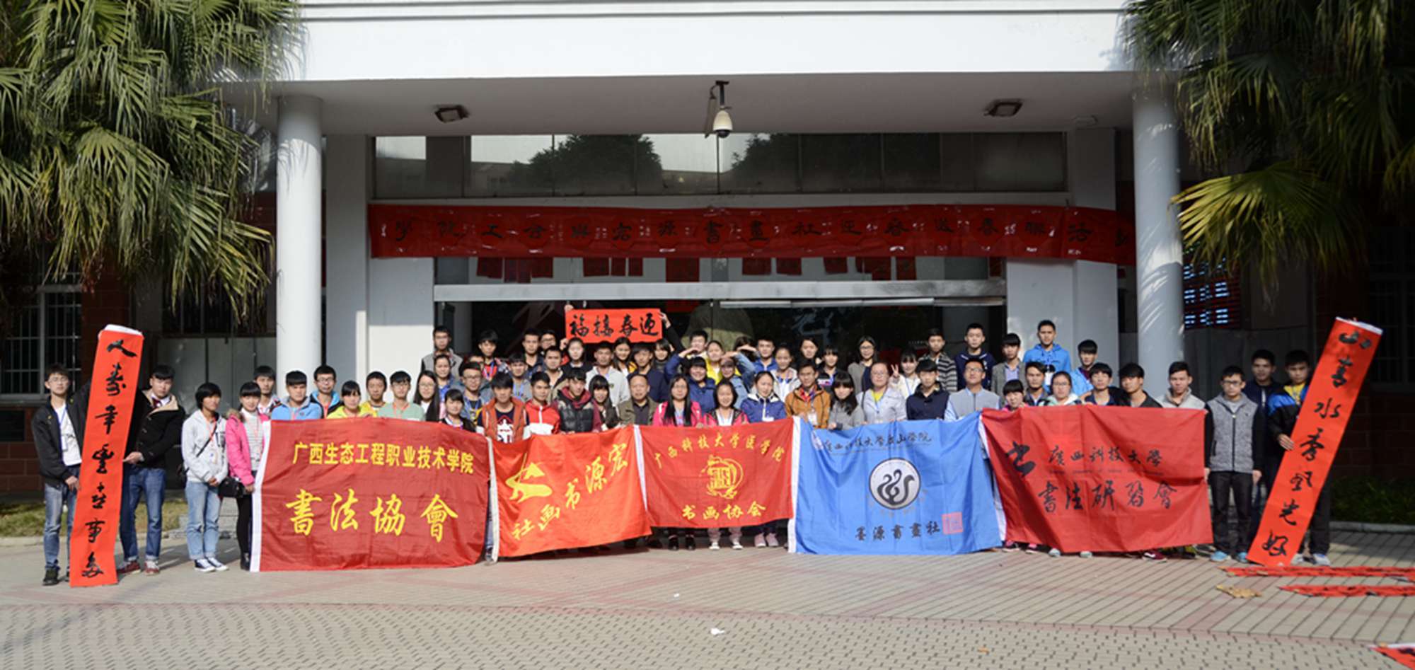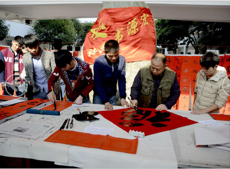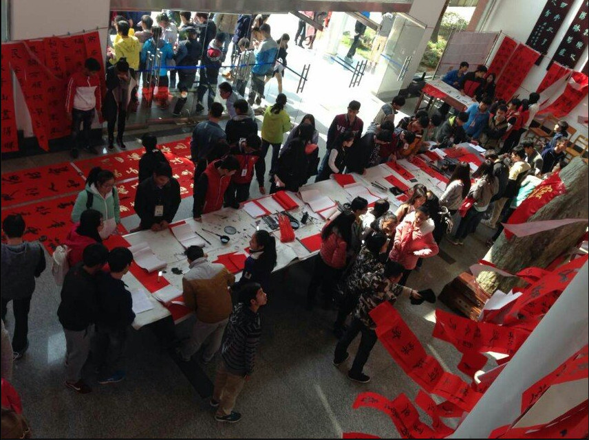新闻网消息(通讯员/艺术系装潢艺术1班 聂小婵 图/杨世海 计算机网络技术1班 江柳青)2015年12月27号中午12:30,宏源书画社送春联活动在博闻楼大厅举行。书画社指导老师王双虎,柳州市书法教育学会会长、宏源书画社辅导老师农嘉琦,学院工会副主席韩国云、宏源书画社历届师兄师姐和柳州市八大高校社团代表近400余人出席活动。