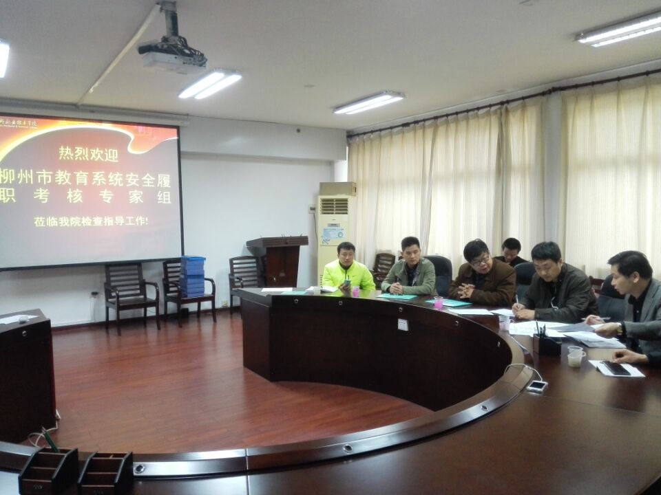 新闻网消息(通讯员/保卫处 喻军华 图/ 保卫处 钟旭)2016年3月29日下午,柳州市教育局安全生产履职检查第九考评组一行六人来我院检查指导安全生产履职工作情况。学院副院长瞿凡、保卫处副处长钟旭、后勤与资产管理处副处长刘恒,及食宿科科长俞罗明参加了汇报会。