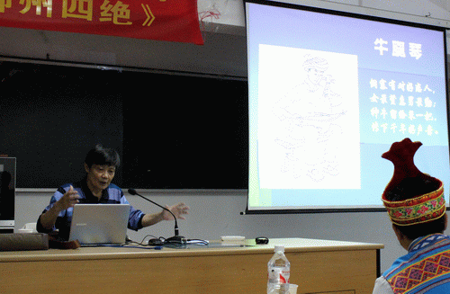 讲座由柳州市民俗专家(原柳州市群众艺术馆副馆长)黄晓平主讲。通过解读经典以及解析刘三姐山歌、展示丰富的非遗图片以及对神话故事的文字解说,让师生们了解了在不断地历史实践中形成的以壮族的歌、瑶族的舞、苗族的节和侗族的楼为代表的柳州“民族风情四绝”,以及非遗传承与发展现状,感受到柳州的民族风情,领略到柳州非物质文化遗产的丰富、内涵和传承?;さ闹匾庖?。