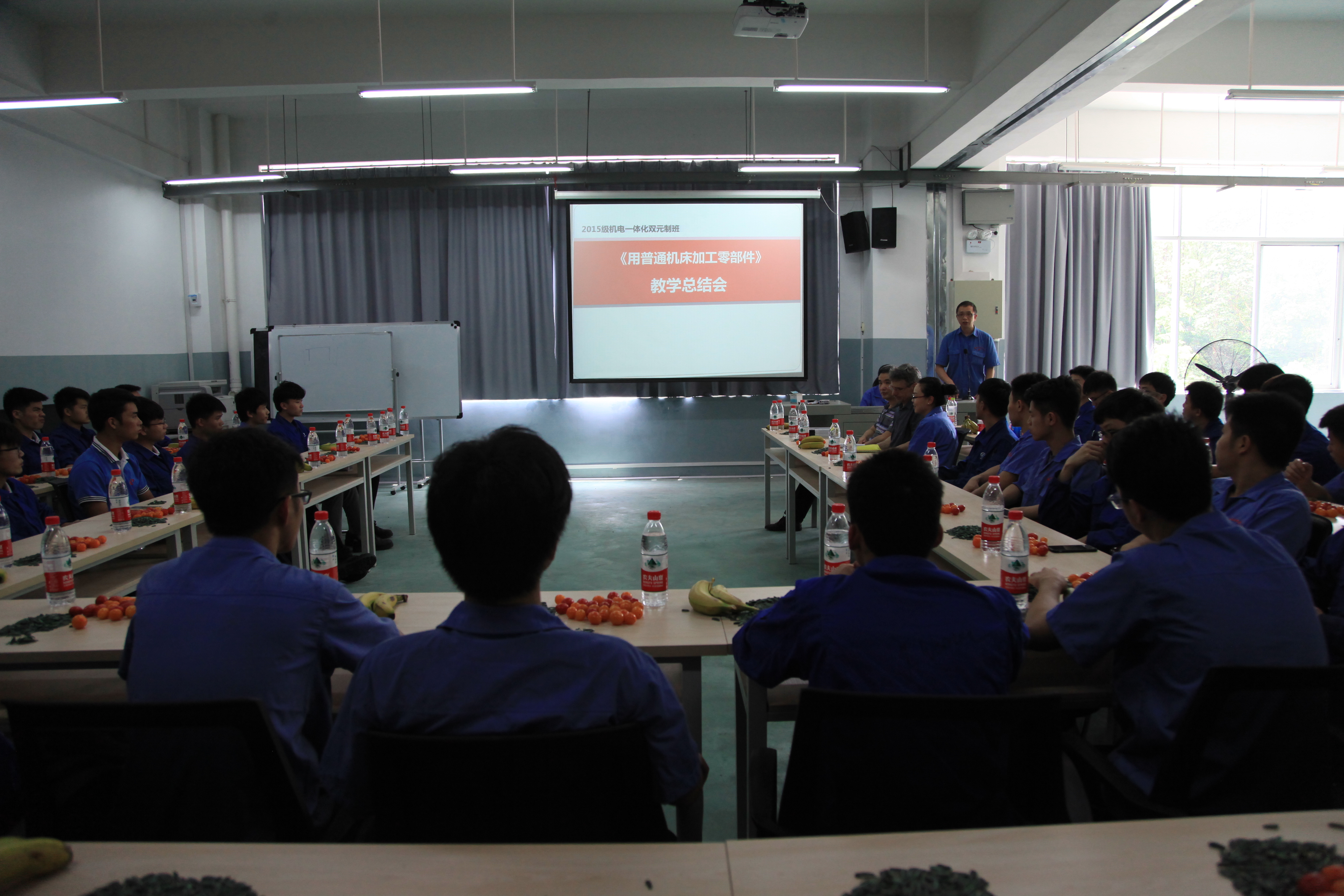 新闻网消息(记者 石玉丹 摄影 朱敬民)5月13日中午1点,机电工程系在新实训楼五楼召开《用普通机床加工零部件》教学总结会。学院党委宣传部部长杨琳、教务与实训管理处副处长黎华,机电工程系主任陈文勇、副主任王大红,项目团队全体老师以及2015机电一体化德国“双元制”班35名学生参加了总结会。陈华老师主持。
