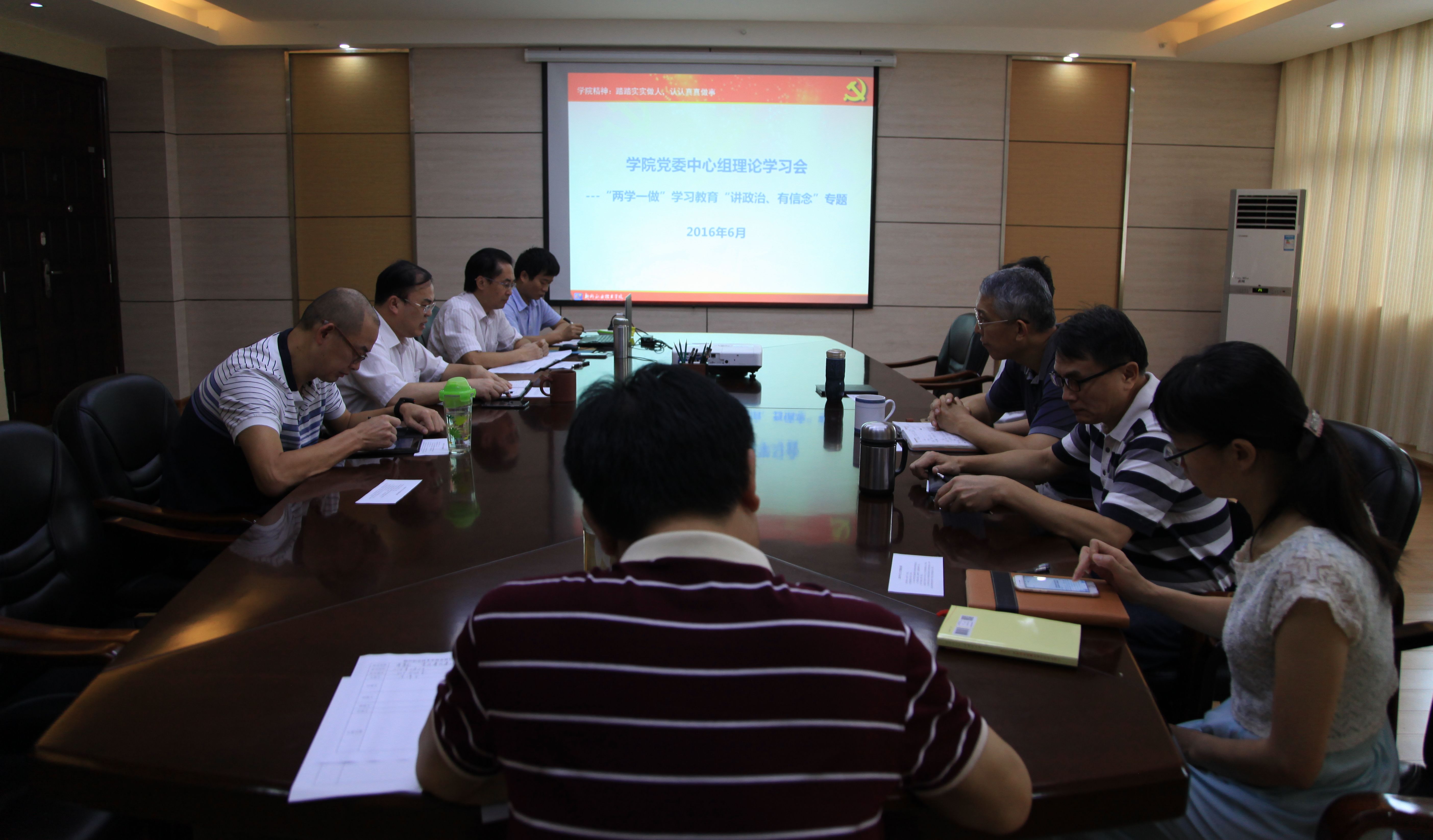 新闻网消息(记者/蓝星华 摄影/朱敬民)6月16日上午,按 “两学一做”学习计划,学院党委中心组在行政楼305会议室举行第一专题“讲政治,有信念”的研讨学习。学院党委书记朱伟才主持、副书记阳旭作重点发言。党委中心组成员石令明、杨毅、林若森、瞿凡、韦林等参加了本次学习会并谈论了自己的学习体会。