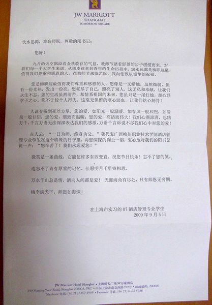 在上海实习的07酒店管理专业学生寄给学院党委副书记阳旭的感谢信截图
