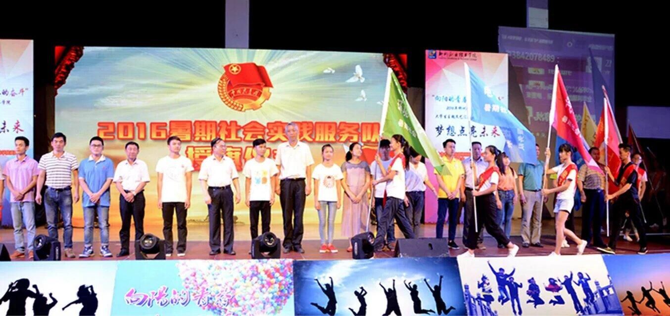 我校暑期社会实践宣传视频播放完毕后,学校2016暑期三下乡社会实践正式启动。十一支服务队的学生代表上台接受我校各级领导的授旗。7月,各服务队将奔赴各贫困山区开展技能帮扶服务,让青春在奉献中闪光。