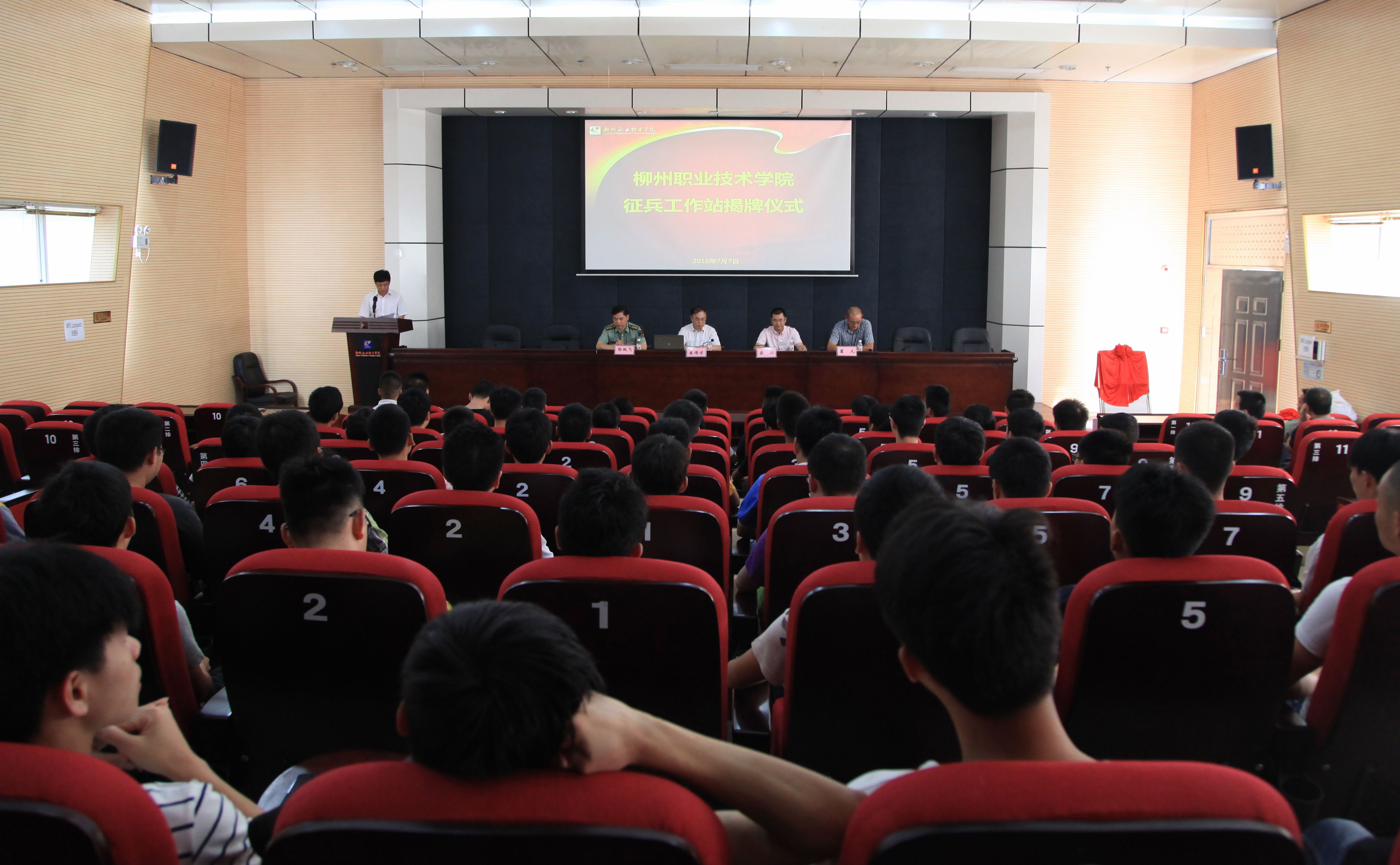 会议在庄严的国歌声中开始。鱼峰区武装部部长郭跃飞宣读了我校成立征兵工作站的命令。双方领导一起为“柳州职业技术学院征兵工作站”揭牌。朱书记代表学校致辞说:我校高度重视大学生征兵工作,扎实开展国防教育,每年向部队输送大学生近30人,我校征兵工作站工作人员一定要继续做好征兵工作,力保将更多优秀大学生输送到军队中去,确保每年学校的征兵工作顺利完成。