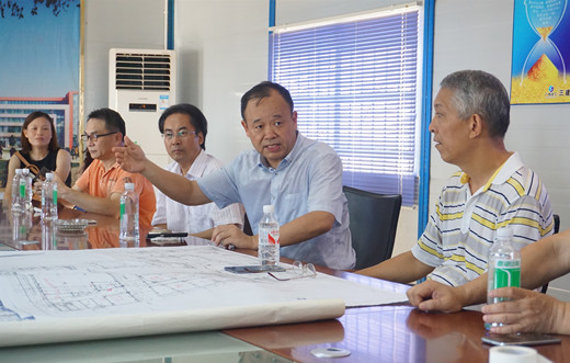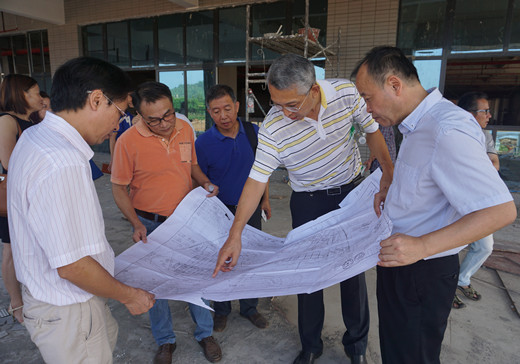 校领导结合图纸研究官塘校区工程建设工作