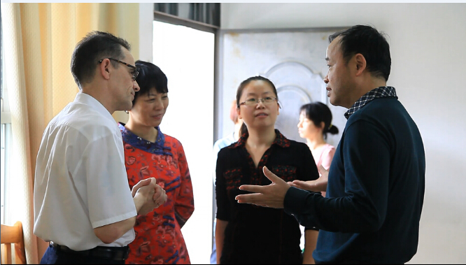 校长石令明(右一)和副校长鞠红霞(左二)看望英国现代学徒制专家Alex(左一)