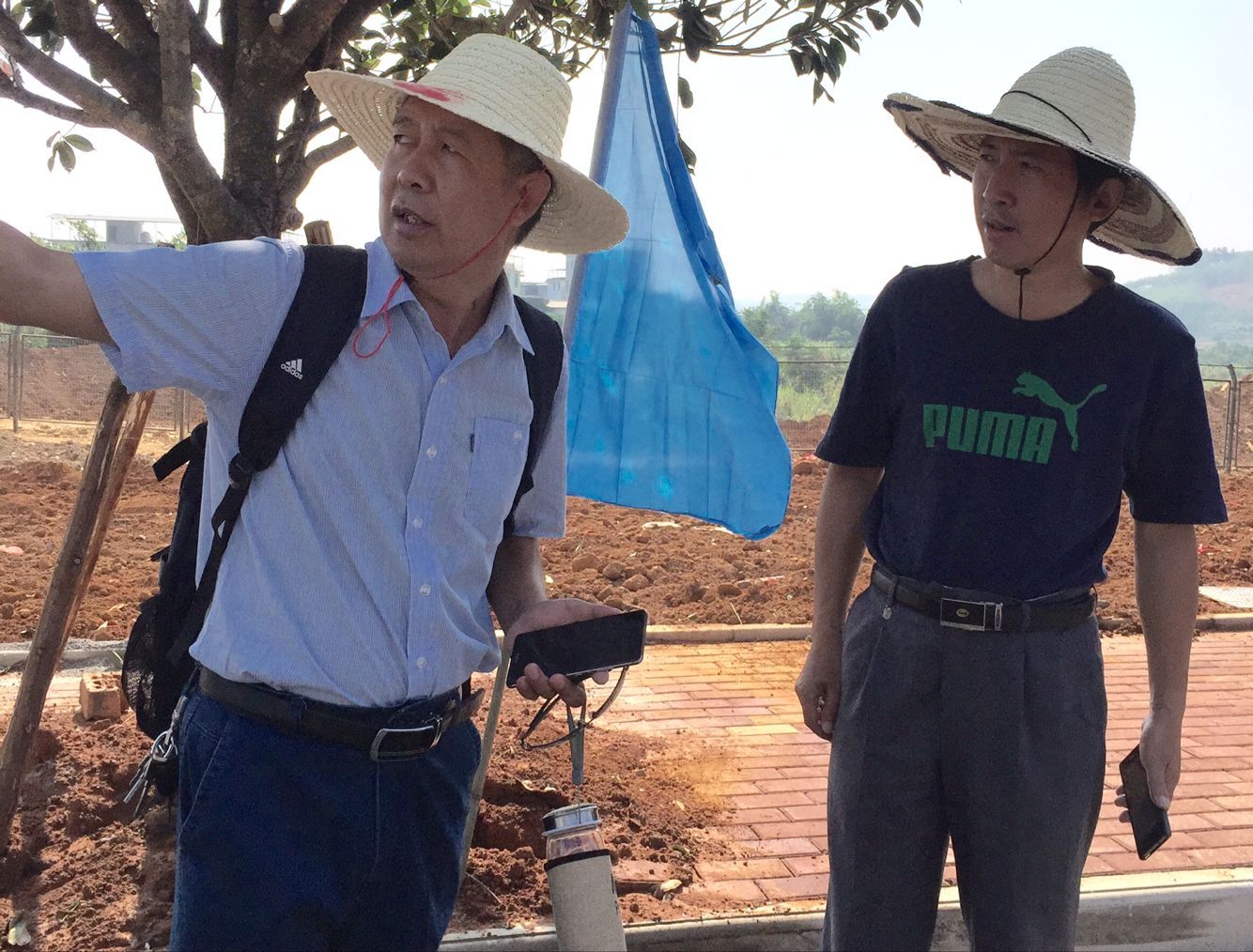 烈日下,严处(左)和后勤处处长邓亮顺(右)在商量工作