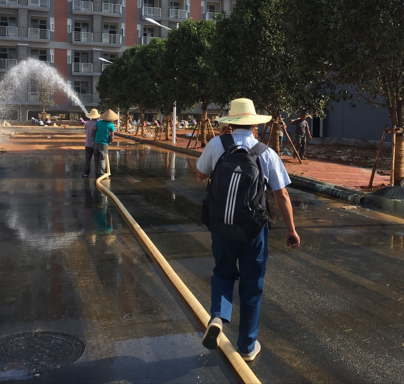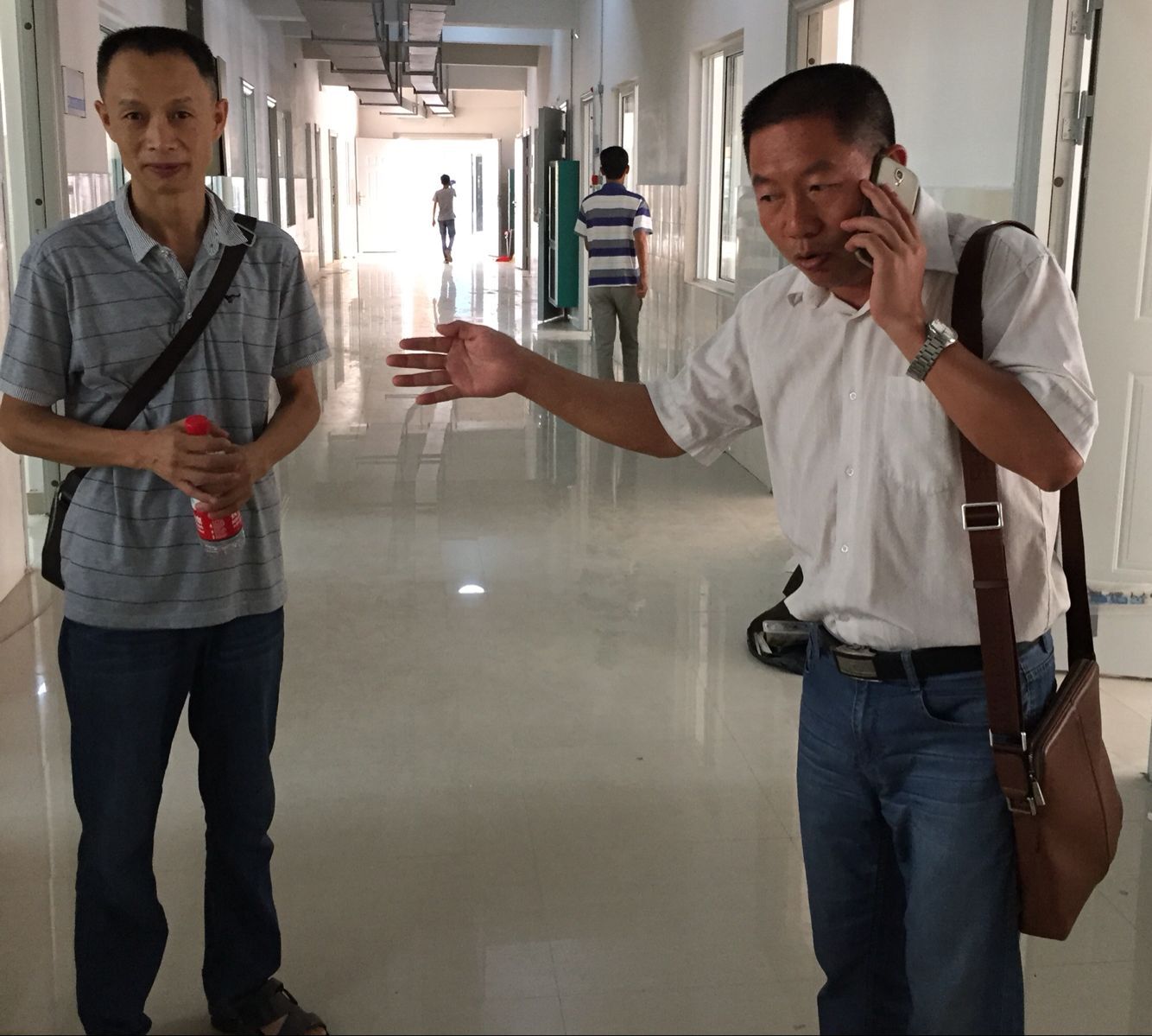 9:30分,头戴草帽、脚穿帆布鞋、背双肩包、着便装、拿着手机的左手腕上还吊着一个水杯的人,是后勤处副处长兼新校区建设办公室主任严泽民。因为所分管的工作,新校区大大小小的事情都是“找严处”,因此,无论是接进来还是拔出去的电话,在记者跟访的一个小时内就没停过。 -