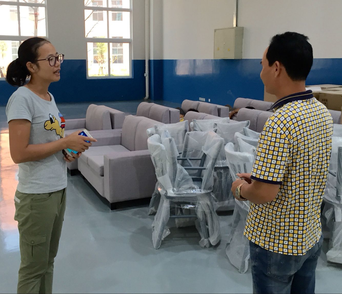 学生们亲昵地叫她为“丽姐!丽姐!”的李丽老师(左)正与施工方在商量工作