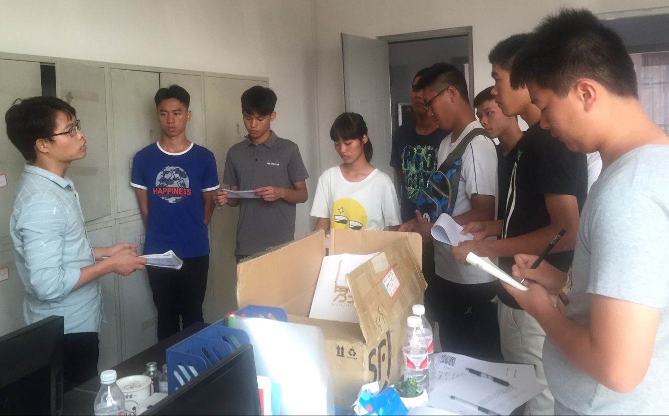 机电工程学院学生科科长韦伟(右一)开碰头会给几个辅导员布置任务