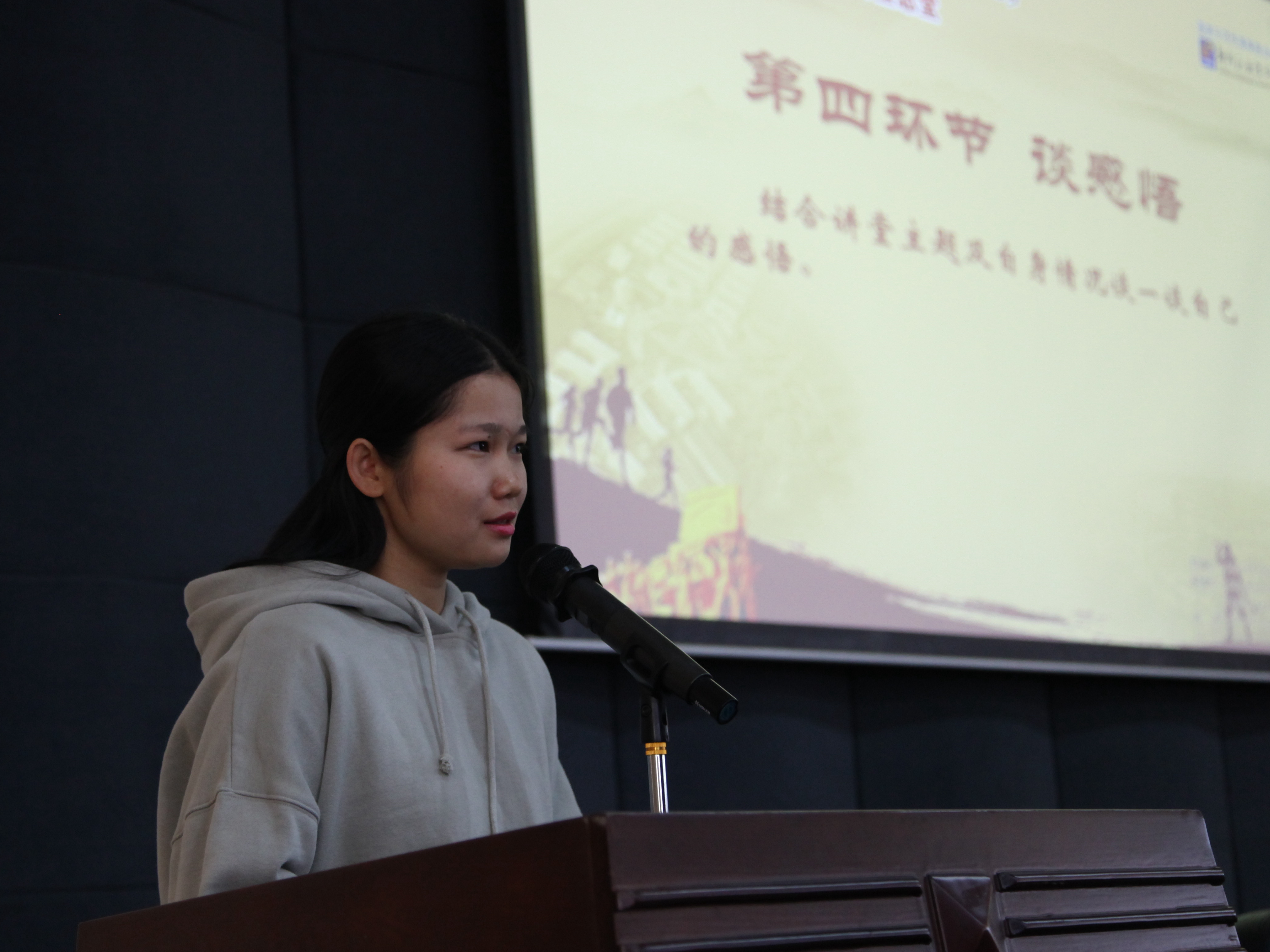 此次活动以培育和弘扬社会主义核心价值观为目标,以柳州市精神文明创建活动为契机,以回顾和继承中国工农红军长征伟大精神、激励我校青年学子争做大国工匠为主要内容,通过“学模范、诵经典、省自身、谈感悟、唱歌曲、送吉祥”六个环节内容展开。参与人员观看了纪录片《长征》(节?。?,回顾了红军长征的英雄壮举和伟大精神;集体诵读了经典诗作《七律·长征》,对如何继承发扬革命先辈伟大精神,走好新长征路,成为大国工匠进行了自我反省,并齐唱了《义勇军进行曲》。三名学生结合讲堂主题和自身实际,分享了朴实、真挚的感悟?;疃詈?,在场领导、老师同学们相互送上鼓励与祝福。