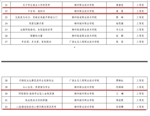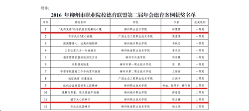 新闻网消息(文、图/学生工作处 莫丽娜)近日,柳州市教育局发布的《关于公布2016年柳州市职业院校德育工作现场会暨柳州市职业院校德育联盟第二届年会德育案例评选获奖名单的通知》(柳教思政【2016】34号),我校钟蒙蒙等9名老师撰写的7篇德育工作案例,在参评53篇案例中脱颖而出,荣获市级荣誉。