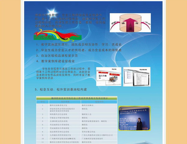 近日,在国家示范性高职院校建设三周年专业成果展示的专题网站,我院信息工程系软件技术专业入选为高职院校专业人才培养模式改革成果展示案例,网站以《项目实战——柳州职业技术学院软件技术专业课程改革》为题,介绍了我院软件技术专业开展的专业课程改革,包括系统化组织课程、项目课程的设计、团队化实施项目教学以及项目教学取得的成果。