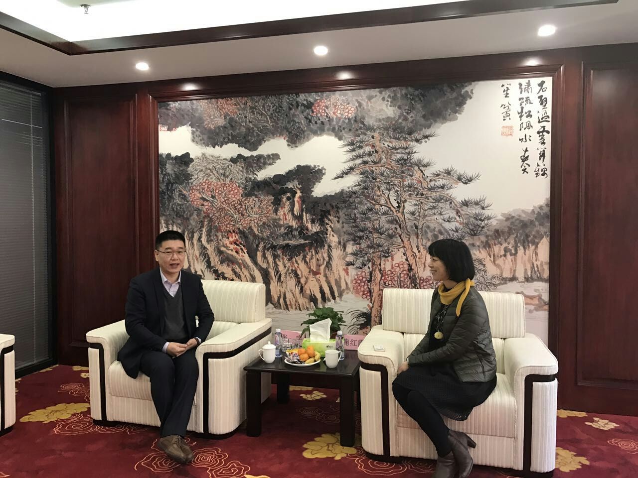 鞠副校长(右)与北京华晟经世信息技术有限公司副总经理张宇洽谈